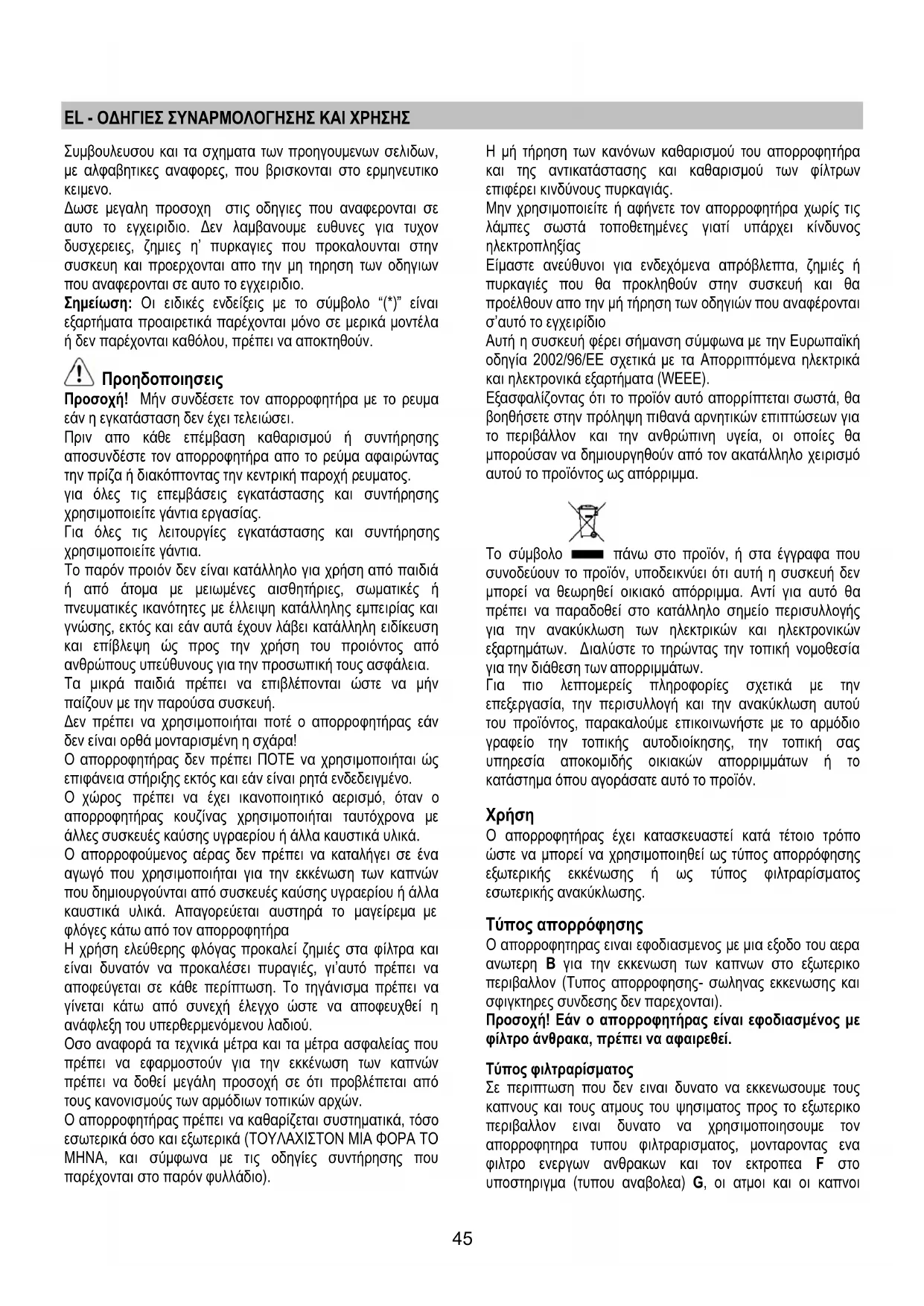 Ο απορροφητήρας δεν πρέπει ΠΟΤΕ να χρησιμοποιήται ώς