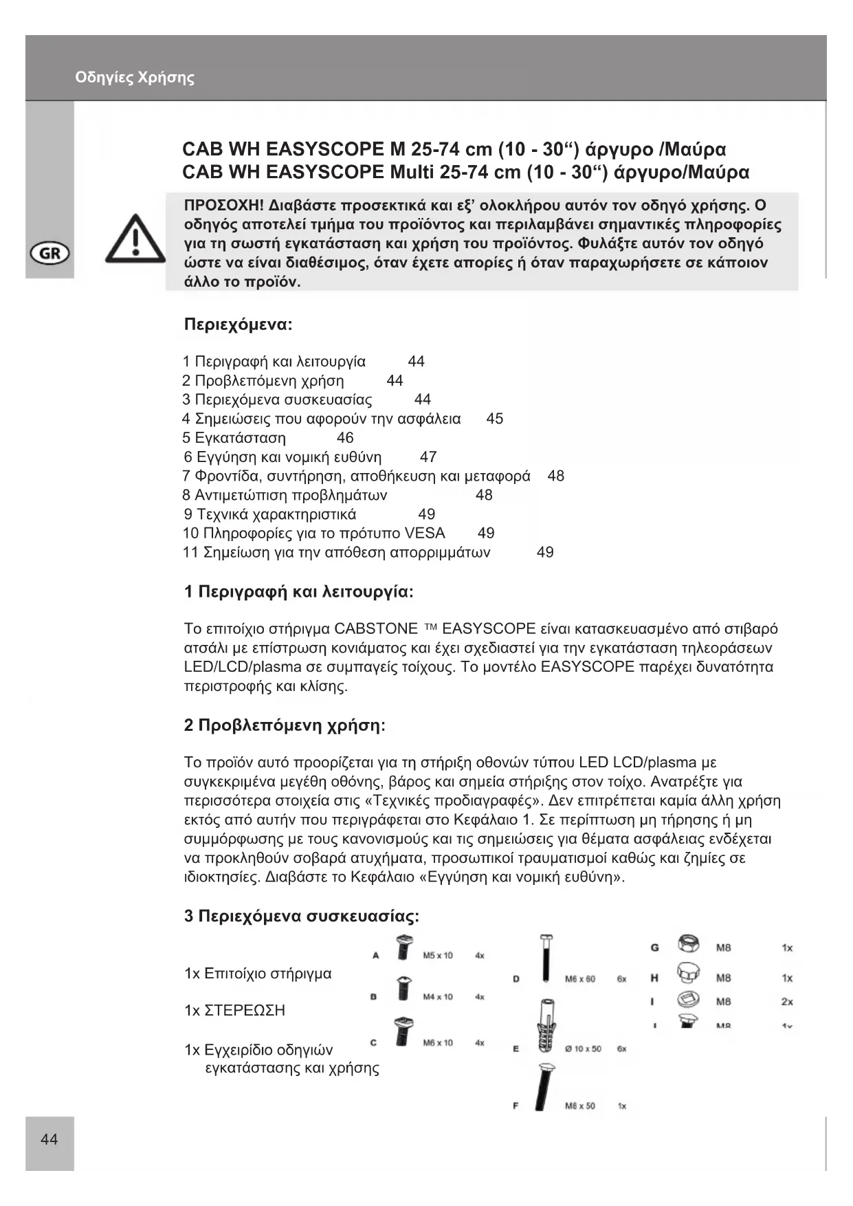 EASYSCOPE είναι κατασκευασμένο από στιβαρό ατσάλι με επίστρωση κονιάματος και έχει σχεδιαστεί για την εγκατάσταση τηλεοράσεων LED/LCD/plasma σε συμπαγείς τοίχους. Το μοντέλο EASYSCOPE παρέχει δυνατότητα περιστροφής και κλίσης. 2 Προβλεπόμενη χρήση: Το προϊόν αυτό προορίζεται για τη στήριξη οθονών τύπου LED LCD/plasma με συγκεκριμένα μεγέθη οθόνης, βάρος και σημεία στήριξης στον τοίχο. Ανατρέξτε για περισσότερα στοιχεία στις «Τεχνικές προδιαγραφές». Δεν επιτρέπεται καμία άλλη χρήση εκτός από αυτήν που περιγράφεται στο Κεφάλαιο 1. Σε περίπτωση μη τήρησης ή μη συμμόρφωσης με τους κανονισμούς και τις σημειώσεις για θέματα ασφάλειας ενδέχεται να προκληθούν σοβαρά ατυχήματα, προσωπικοί τραυματισμοί καθώς και ζημίες σε ιδιοκτησίες. Διαβάστε το Κεφάλαιο «Εγγύηση και νομική ευθύνη». 3 Περιεχόμενα συσκευασίας: 1x Επιτοίχιο στήριγμα 1x ΣΤΕΡΕΩΣΗ 1x Εγχειρίδιο οδηγιών εγκατάστασης και χρήσης Περιεχόμενα: 1 Περιγραφή και λειτουργία 44 2 Προβλεπόμενη χρήση 44 3 Περιεχόμενα συσκευασίας 44 4 Σημειώσεις που αφορούν την ασφάλεια 45 5 Εγκατάσταση 46 6 Εγγύηση και νομική ευθύνη 47 7 Φροντίδα, συντήρηση, αποθήκευση και μεταφορά 48 8 Αντιμετώπιση προβλημάτων 48 9 Τεχνικά χαρακτηριστικά 49 10 Πληροφορίες για το πρότυπο VESA 49 11 Σημείωση για την απόθεση απορριμμάτων 49 ΠΡΟΣΟΧΗ! Διαβάστε προσεκτικά και εξ’ ολοκλήρου αυτόν τον οδηγό χρήσης. Ο οδηγός αποτελεί τμήμα του προϊόντος και περιλαμβάνει σημαντικές πληροφορίες για τη σωστή εγκατάσταση και χρήση του προϊόντος. Φυλάξτε αυτόν τον οδηγό ώστε να είναι διαθέσιμος, όταν έχετε απορίες ή όταν παραχωρήσετε σε κάποιον άλλο το προϊόν. CAB WH EASYSCOPE M 25-74 cm (10 - 30“) άργυρο /Mαύρα CAB WH EASYSCOPE Multi 25-74 cm (10 - 30“) άργυρο/Mαύρα Οδηγίες Χρήσης45