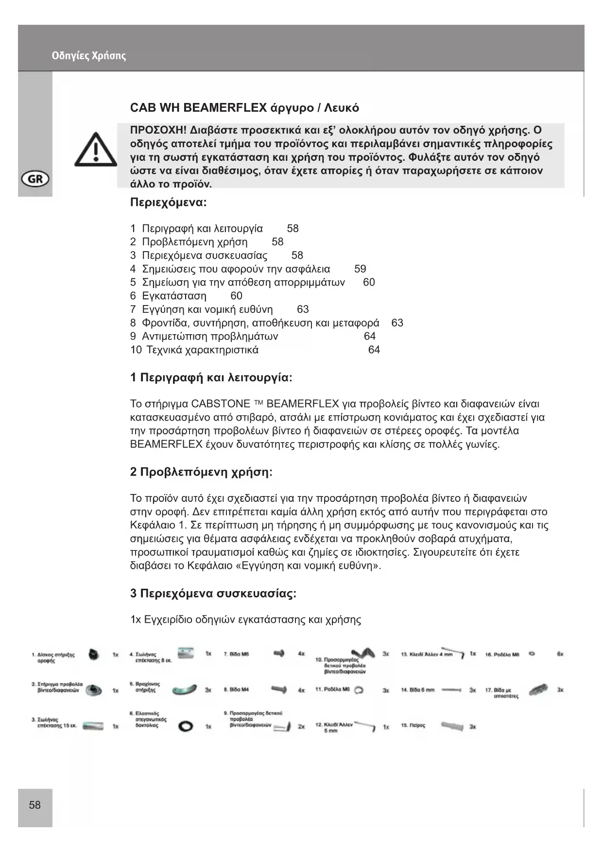 BEAMERFLEX για προβολείς βίντεο και διαφανειών είναι κατασκευασμένο από στιβαρό, ατσάλι με επίστρωση κονιάματος και έχει σχεδιαστεί για την προσάρτηση προβολέων βίντεο ή διαφανειών σε στέρεες οροφές. Τα μοντέλα BEAMERFLEX έχουν δυνατότητες περιστροφής και κλίσης σε πολλές γωνίες. 2 Προβλεπόμενη χρήση: Το προϊόν αυτό έχει σχεδιαστεί για την προσάρτηση προβολέα βίντεο ή διαφανειών στην οροφή. Δεν επιτρέπεται καμία άλλη χρήση εκτός από αυτήν που περιγράφεται στο Κεφάλαιο 1. Σε περίπτωση μη τήρησης ή μη συμμόρφωσης με τους κανονισμούς και τις σημειώσεις για θέματα ασφάλειας ενδέχεται να προκληθούν σοβαρά ατυχήματα, προσωπικοί τραυματισμοί καθώς και ζημίες σε ιδιοκτησίες. Σιγουρευτείτε ότι έχετε διαβάσει το Κεφάλαιο «Εγγύηση και νομική ευθύνη». 3 Περιεχόμενα συσκευασίας: 1x Εγχειρίδιο οδηγιών εγκατάστασης και χρήσης Οδηγίες Χρήσης59