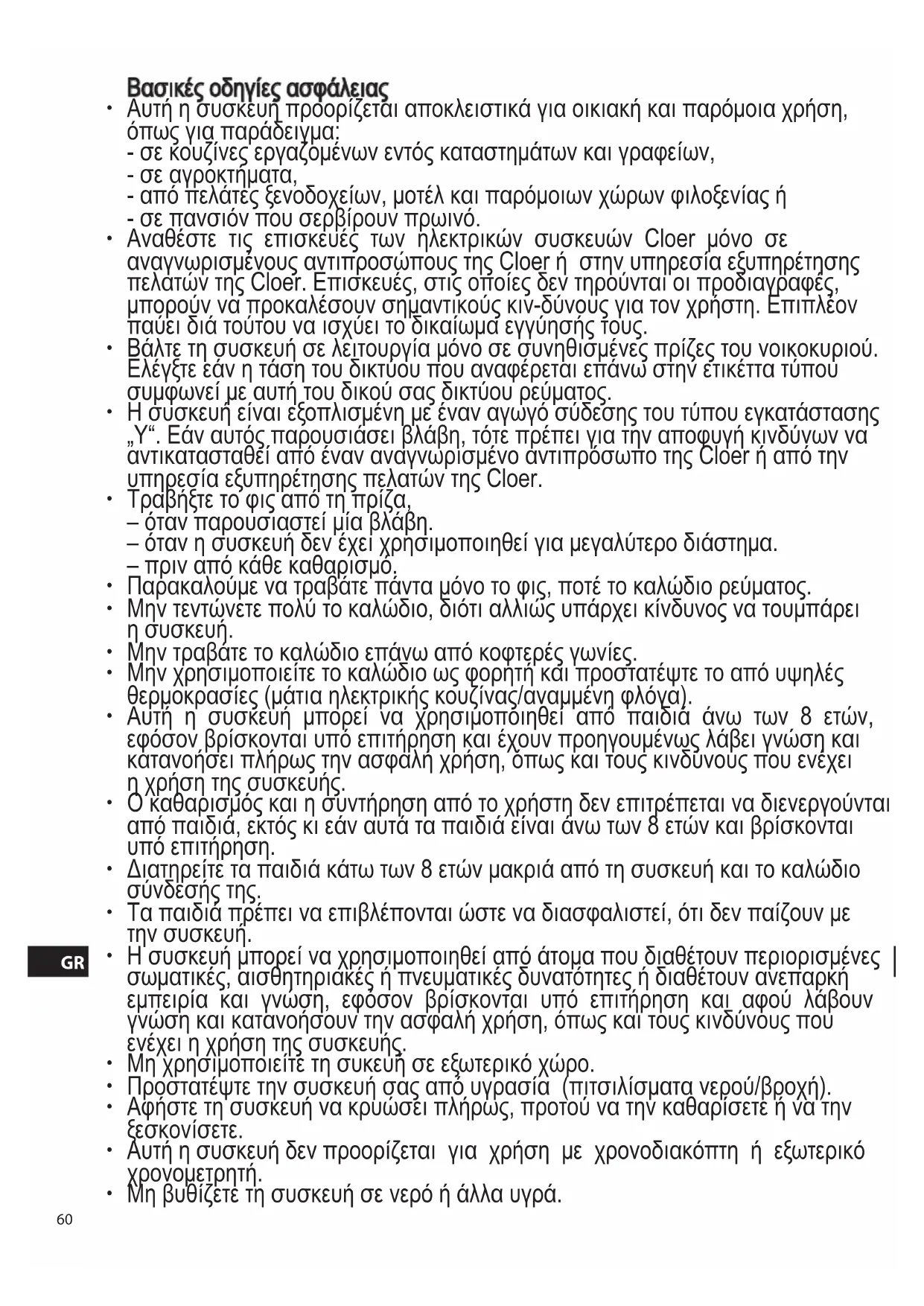 CZ60 Βασικές οδηγίες ασφάλειας Αυτή η συσκευή προορίζεται αποκλειστικά για οικιακή και παρόμοια χρήση, όπως για παράδειγμα: - σε κουζίνες εργαζομένων εντός καταστημάτων και γραφείων, - σε αγροκτήματα, - από πελάτες ξενοδοχείων, μοτέλ και παρόμοιων χώρων φιλοξενίας ή - σε πανσιόν που σερβίρουν πρωινό. Αναθέστε τις επισκευές των ηλεκτρικών συσκευών Cloer μόνο σε αναγνωρισμένους αντιπροσώπους της Cloer ή στην υπηρεσία εξυπηρέτησης πελατών της Cloer. Επισκευές, στις οποίες δεν τηρούνται οι προδιαγραφές, μπορούν να προκαλέσουν σημαντικούς κιν-δύνους για τον χρήστη. Επιπλέον παύει διά τούτου να ισχύει το δικαίωμα εγγύησής τους. Βάλτε τη συσκευή σε λειτουργία μόνο σε συνηθισμένες πρίζες του νοικοκυριού. Ελέγξτε εάν η τάση του δικτύου που αναφέρεται επάνω στην ετικέττα τύπου συμφωνεί με αυτή του δικού σας δικτύου ρεύματος. Η συσκευή είναι εξοπλισμένη με έναν αγωγό σύδεσης του τύπου εγκατάστασης „Y“. Εάν αυτός παρουσιάσει βλάβη, τότε πρέπει για την αποφυγή κινδύνων να αντικατασταθεί από έναν αναγνωρισμένο αντιπρόσωπο της Cloer ή από την υπηρεσία εξυπηρέτησης πελατών της Cloer. Τραβήξτε το φις από τη πρίζα, – όταν παρουσιαστεί μία βλάβη. – όταν η συσκευή δεν έχει χρησιμοποιηθεί για μεγαλύτερο διάστημα. – πριν από κάθε καθαρισμό. Παρακαλούμε να τραβάτε πάντα μόνο το φις, ποτέ το καλώδιο ρεύματος. Μην τεντώνετε πολύ το καλώδιο, διότι αλλιώς υπάρχει κίνδυνος να τουμπάρει