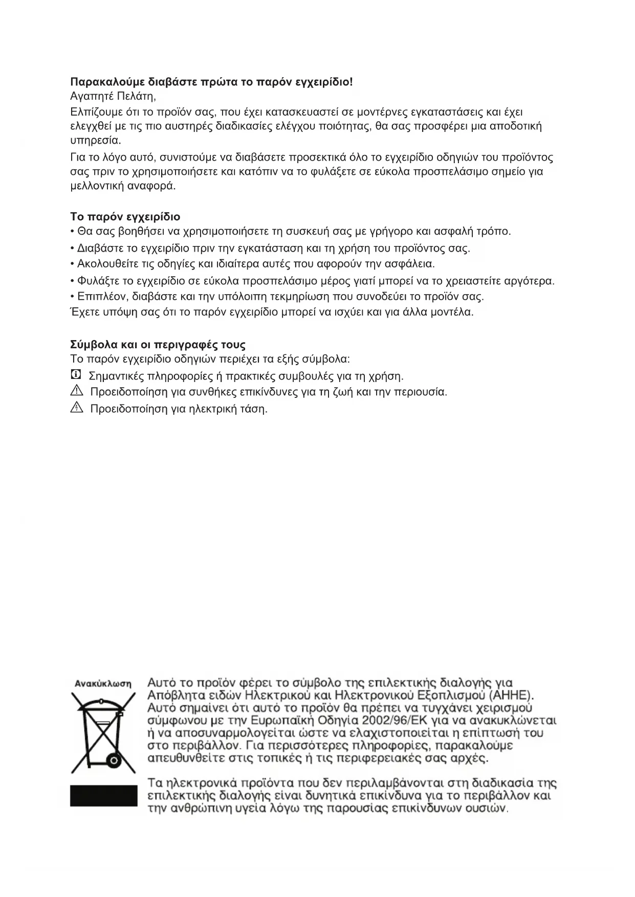 Για το λόγο αυτό, συνιστούμε να διαβάσετε προσεκτικά όλο το εγχειρίδιο οδηγιών του προϊόντος σας πριν το χρησιμοποιήσετε και κατόπιν να το φυλάξετε σε εύκολα προσπελάσιμο σημείο για μελλοντική αναφορά. Το παρόν εγχειρίδιο