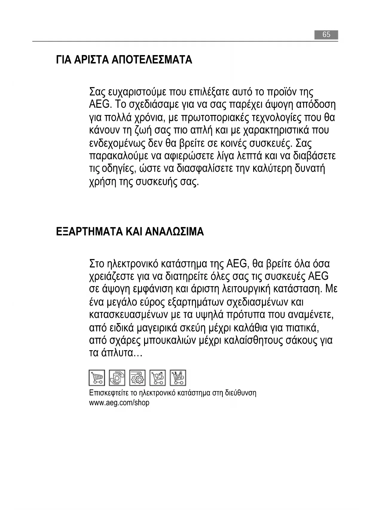 οδηγίες, ώστε να διασφαλίσετε την καλύτερη δυνατή χρήση της συσκευής σας. ΕΞΑΡΤΗΜΑΤΑ ΚΑΙ ΑΝΑΛΩΣΙΜΑ Στο ηλεκτρονικό κατάστημα της AEG, θα βρείτε όλα όσα χρειάζεστε για να διατηρείτε όλες σας τις συσκευές AEG σε άψογη εμφάνιση και άριστη λειτουργική κατάσταση. Με ένα μεγάλο εύρος εξαρτημάτων σχεδιασμένων και κατασκευασμένων με τα υψηλά πρότυπα που αναμένετε,