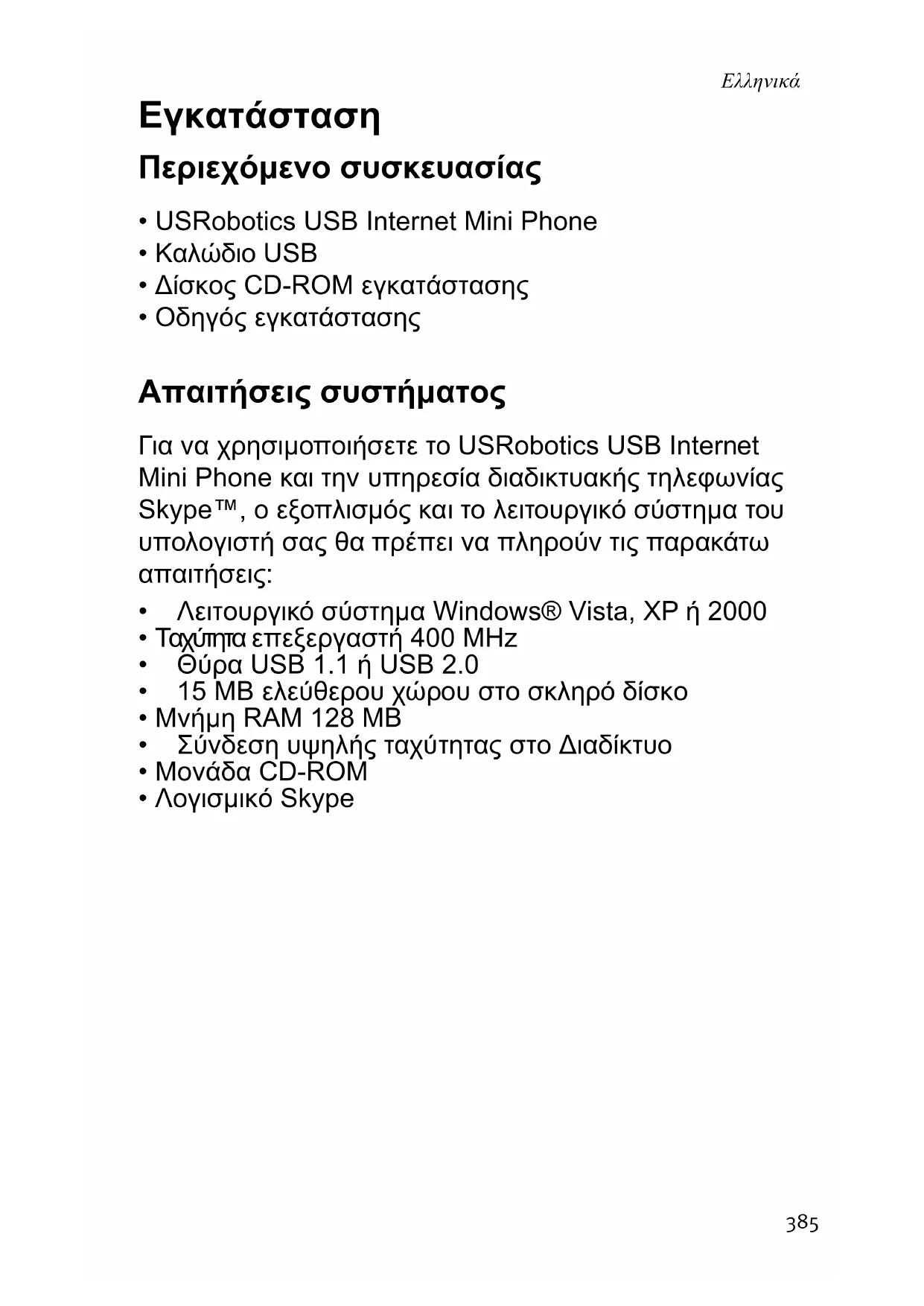 - Οδηγός εγκατάστασης Απαιτήσεις συστήματος Για να χρησιμοποιήσετε το USRobotics USB Internet Mini Phone και την υπηρεσία διαδικτυακής τηλεφωνίας Skype™, ο εξοπλισμός και το λειτουργικό σύστημα του υπολογιστή σας θα πρέπει να πληρούν τις παρακάτω απαιτήσεις:
