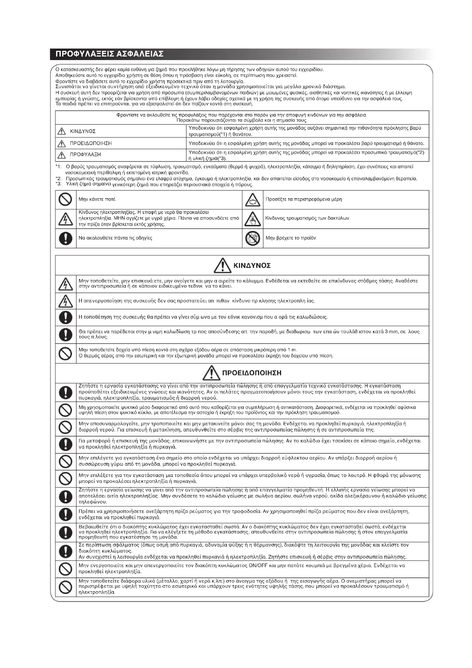 Πρέπει να χρησιμοποιήσετε ανεξάρτητη πρίζα ρεύματος για την τροφοδοσία. Αν χρησιμοποιηθεί πρίζα ρεύματος που δεν είναι ανεξάρτητη, ενδέχεται να προκληθεί πυρκαγιά. Βεβαιωθείτε τι ο διακπτης κυκλώματος έχει εγκατασταθεί σωστά. Αν ο διακπτης κυκλώματος δεν έχει εγκατασταθεί σωστά, ενδέχεται να προκληθεί ηλεκτροπληξία. Για να ελέγξετε τη μέθοδο εγκατάστασης, απευθυνθείτε στην αντιπροσωπεία πώλησης ή στον επαγγελματία προμηθευτή που εγκατέστησε τη μονάδα. Σε περίπτωση σφάλματος (πως οσμή απ πυρκαγιά, αδυναμία ψύξης ή η θέρμανσης), διακψτε τη λειτουργία της μονάδας και κλείστε τον διακπτη κυκλώματος. Αν συνεχιστεί η λειτουργία ενδέχεται να προκληθεί πυρκαγιά ή ηλεκτροπληξία. Ζητήστε επισκευή ή σέρβις στην αντιπροσωπεία πώλησης. Μην ενεργοποιείτε και μην απενεργοποιείτε τον διακπτη κυκλώματος ON/OFF και μην πατάτε κουμπιά με βρεγμένα χέρια. Ενδέχεται να προκληθεί ηλεκτροπληξία. Μην τοποθετείτε διάφορα υλικά (μέταλλο, χαρτί ή νερ κ.λπ.) στο άνοιγμα της εξδου ή της εισαγωγής αέρα. Ο ανεμιστήρας μπορεί να περιστρέφεται με υψηλή ταχύτητα στο εσωτερικ και υπάρχουν τρεις εντητες υψηλής τάσης, που μπορεί να προκαλέσουν τραυματισμ ή ηλεκτροπληξία. *1: ȅ ȕĮȡȪȢ IJȡĮȣȝĮIJȚıȝȩȢ ĮȞĮijȑȡİIJĮȚ ıİ IJȪijȜȦıȘ, IJȡĮȣȝĮIJȚıȝȩ, İȖțĮȪȝĮIJĮ (șİȡȝȐ Ȓ ȥȣȤȡȐ), ȘȜİțIJȡȠʌȜȘȟȓĮ, țȐIJĮȖȝĮ Ȓ įȘȜȘIJȘȡȓĮıȘ, ȑȤİȚ ıȣȞȑʌİȚİȢ țĮȚ ĮʌĮȚIJİȓ ȞȠıȠțȠȝİȚĮțȒ ʌİȡȓșĮȜȥȘ Ȓ İțIJİIJĮȝȑȞȘ ȚĮIJȡȚțȒ ijȡȠȞIJȓįĮ. *2: ȆȡȠıȦʌȚțȩȢ IJȡĮȣȝĮIJȚıȝȩȢ ıȘȝĮȓȞİȚ ȑȞĮ İȜĮijȡȪ ĮIJȪȤȘȝĮ, ȑȖțĮȣȝĮ Ȓ ȘȜİțIJȡȠʌȜȘȟȓĮ, țĮȚ įİȞ ĮʌĮȚIJİȓIJĮȚ İȓıȠįȠȢ ıIJȠ ȞȠıȠțȠȝİȓȠ Ȓ İʌĮȞĮȜĮȝȕĮȞȩȝİȞȘ șİȡĮʌİȓĮ. *3: ȊȜȚțȒ ȗȘȝȚȐ ıȘȝĮȓȞİȚ ȖİȞȚțȩIJİȡȘ ȗȘȝȚȐ ʌȠȣ İʌȘȡİȐȗİȚ ʌİȡȚȠȣıȚĮțȐ ıIJȠȚȤİȓĮ Ȓ ʌȩȡȠȣȢ. TSB 1110650175 (09_GR).indd 35 5/21/12 2:41 PMJταν η μονάδα του κλιματιστικού δεν παράγει ούτε ψύξη ούτε θέρμανση, ενδέχεται να υπάρχει διαρροή ψυκτικού. Απευθυνθείτε στην αντιπροσωπεία πώλησης. Το ψυκτικ που χρησιμοποιείται στη μονάδα του κλιματιστικού είναι ασφαλές. Δεν διαρρέει σε κανονικές συνθήκες λειτουργίας αλλά αν διαρρεύσει στο δωμάτιο και έρθει σε επαφή με πηγή θερμτητας πως ένα καλοριφέρ ή μια ηλεκτρική κουζίνα, ενδέχεται να προκληθεί επικίνδυνη αντίδραση. Jταν εισχωρήσει νερ ή άλλες ξένες ουσίες στα εσωτερικά μέρη, διακψτε αμέσως τη λειτουργία της μονάδας και κλείστε τον διακπτη κυκλώματος. Η διαρκής λειτουργία της μονάδας ενδέχεται να προκαλέσει πυρκαγιά ή ηλεκτροπληξία. Απευθυνθείτε στην αντιπροσωπεία πώλησης για επισκευή. Μην καθαρίζετε το εσωτερικ της μονάδας του κλιματιστικού μνοι σας. Ζητήστε εσωτερικ καθαρισμ της μονάδας του κλιματιστικού απ την αντιπροσωπεία πώλησης. Ο εσφαλμένος καθαρισμς μπορεί να προκαλέσει θρυμματισμ των μερών απ ρητίνη ή φθορά της μνωσης των ηλεκτρικών μερών, προκαλώντας διαρροή νερού, ηλεκτροπληξία ή πυρκαγιά. Μην φθείρετε και μην τροποποιείτε το καλώδιο τροφοδοσίας. Μην συνδέετε το καλώδιο στη μέση και μην χρησιμοποιείτε καλώδιο επέκτασης με πολλαπλές πρίζες που χρησιμοποιούν και άλλες συσκευές. Σε περίπτωση που δεν το πράξετε, μπορεί να προκληθεί πυρκαγιά. Μην τοποθετείτε βαριά αντικείμενα πάνω στο καλώδιο τροφοδοσίας, μην το αφήνετε εκτεθειμένο στη ζέστη και μην το τραβάτε. Αν το πράξετε, μπορεί να προκληθεί ηλεκτροπληξία ή πυρκαγιά. Μην εκτίθεστε απευθείας στoν κρύo αέρα επί μεγάλες χρoνικές περιδoυς. Μην εισάγετε τα δάχτυλά σας ή αντικείμενα στην εισαγωγή/έξoδo τoυ αέρα. ΠΡOΦΥΛΑΞΗ Βεβαιωθείτε τι το νερ αποστραγγίζετα
