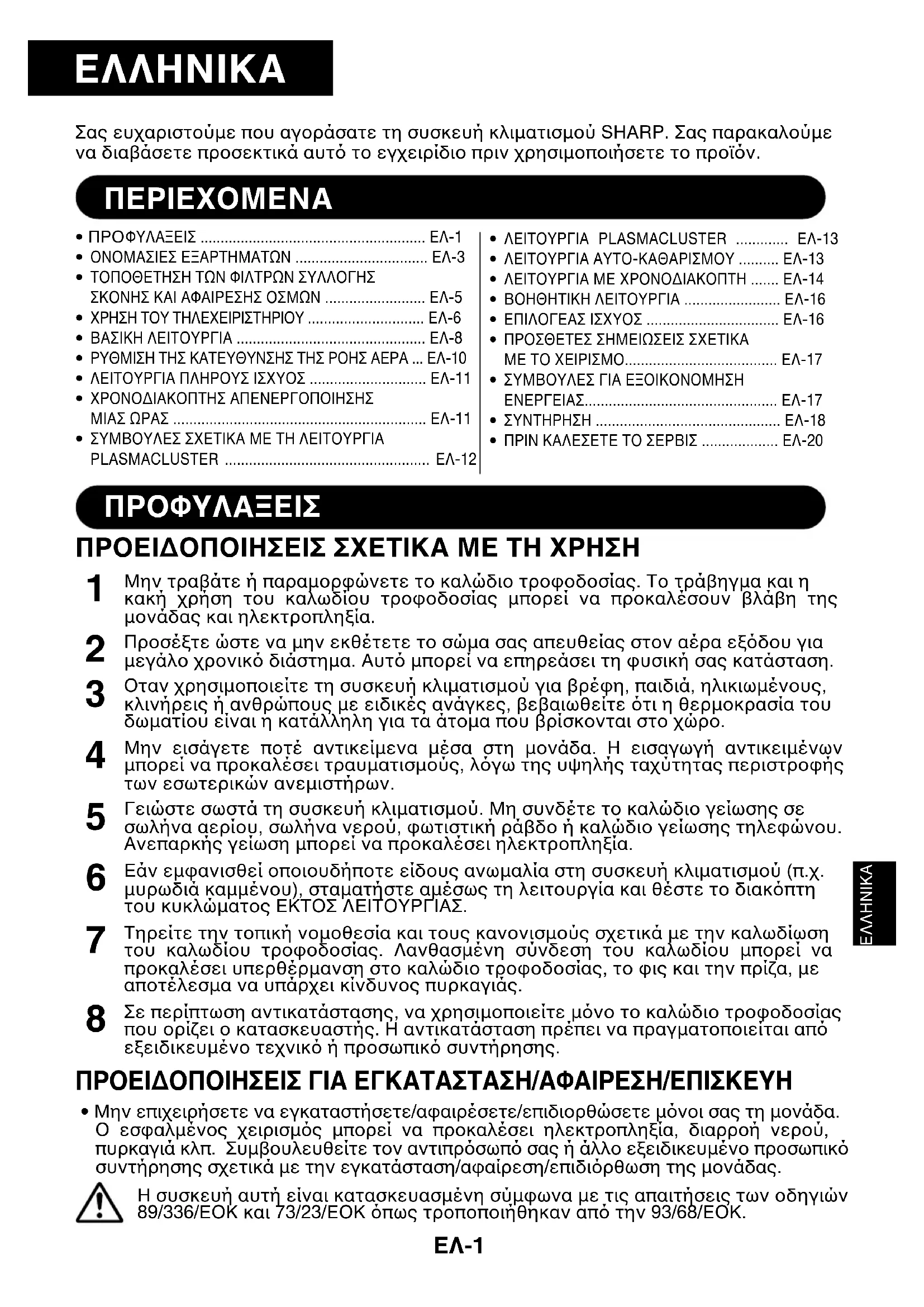 - No caso por exemplo, em que exista muito fumo de tabaco na sala antes do ar condicionado ser ligado, o SENSOR DE ODORES poderá não reagir.ΕΛΛΗΝΙΚΑΣας ευχαριστούµε που αγοράσατε τη συσκευή κλιµατισµού SHARP. Σας παρακαλούµενα διαβάσετε προσεκτικά αυτ& το εγχειρίδιο πριν χρησιµοποιήσετε το προϊ&ν.• ΠΡΟΦΥΛΑΞΕΙΣ ........................................................ EΛ-1 ΟΝΟΜΑΣΙΕΣ ΕΞΑΡΤΗΜΑΤΩΝ ................................. EΛ-3 ΤΟΠΟΘΕΤΗΣΗ ΤΩΝ ΦΙΛΤΡΩΝ ΣΥΛΛΟΓΗΣΣΚΟΝΗΣ ΚΑΙ ΑΦΑΙΡΕΣΗΣ ΟΣΜΩΝ ......................... EΛ-5 ΧΡΗΣΗ ΤΟΥ ΤΗΛΕΧΕΙΡΙΣΤΗΡΙΟΥ ............................. EΛ-6 ΒΑΣΙΚΗ ΛΕΙΤΟΥΡΓΙΑ ............................................... EΛ-8 ΡΥΘΜΙΣΗ ΤΗΣ ΚΑΤΕΥΘΥΝΣΗΣ ΤΗΣ ΡΟΗΣ ΑΕΡΑ ... EΛ-10 ΛΕΙΤΟΥΡΓΙΑ ΠΛΗΡΟΥΣ ΙΣΧΥΟΣ ............................. EΛ-11 ΧΡΟΝΟ∆ΙΑΚΟΠΤΗΣ ΑΠΕΝΕΡΓΟΠΟΙΗΣΗΣΜΙΑΣ ΩΡΑΣ ............................................................... EΛ-11