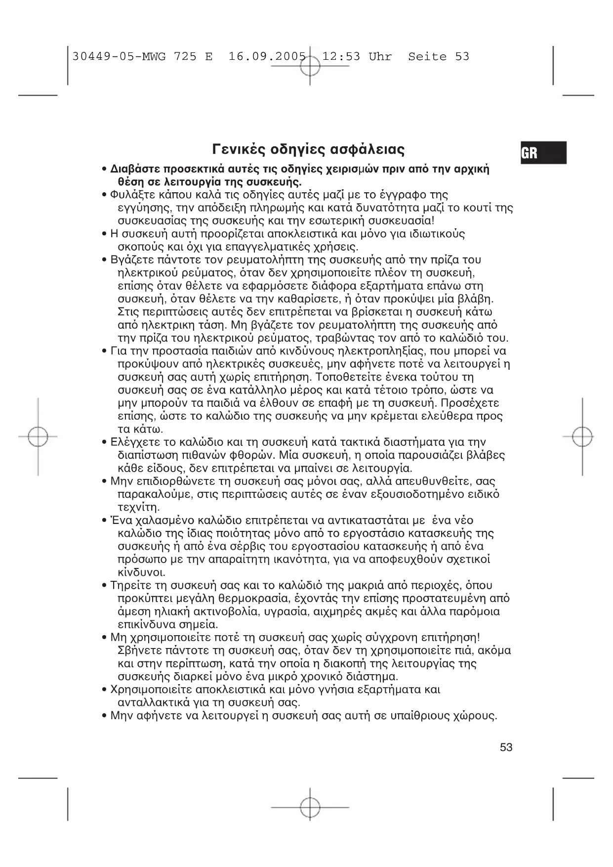 30449-05-MWG 725 E 16.09.2005 12:53 Uhr Seite 53• Η συσκευή αυτή δεν επιτρέπεται να βυθίζεται κατά κανένα τρπο µέσα σε νερ ή άλλα υγρά, ή να έρχεται σε επαφή µε υγρά. Μη χρησιµοποιείτε τη συσκευή σας, ταν έχετε βρεγµένα ή υγρά χέρια.