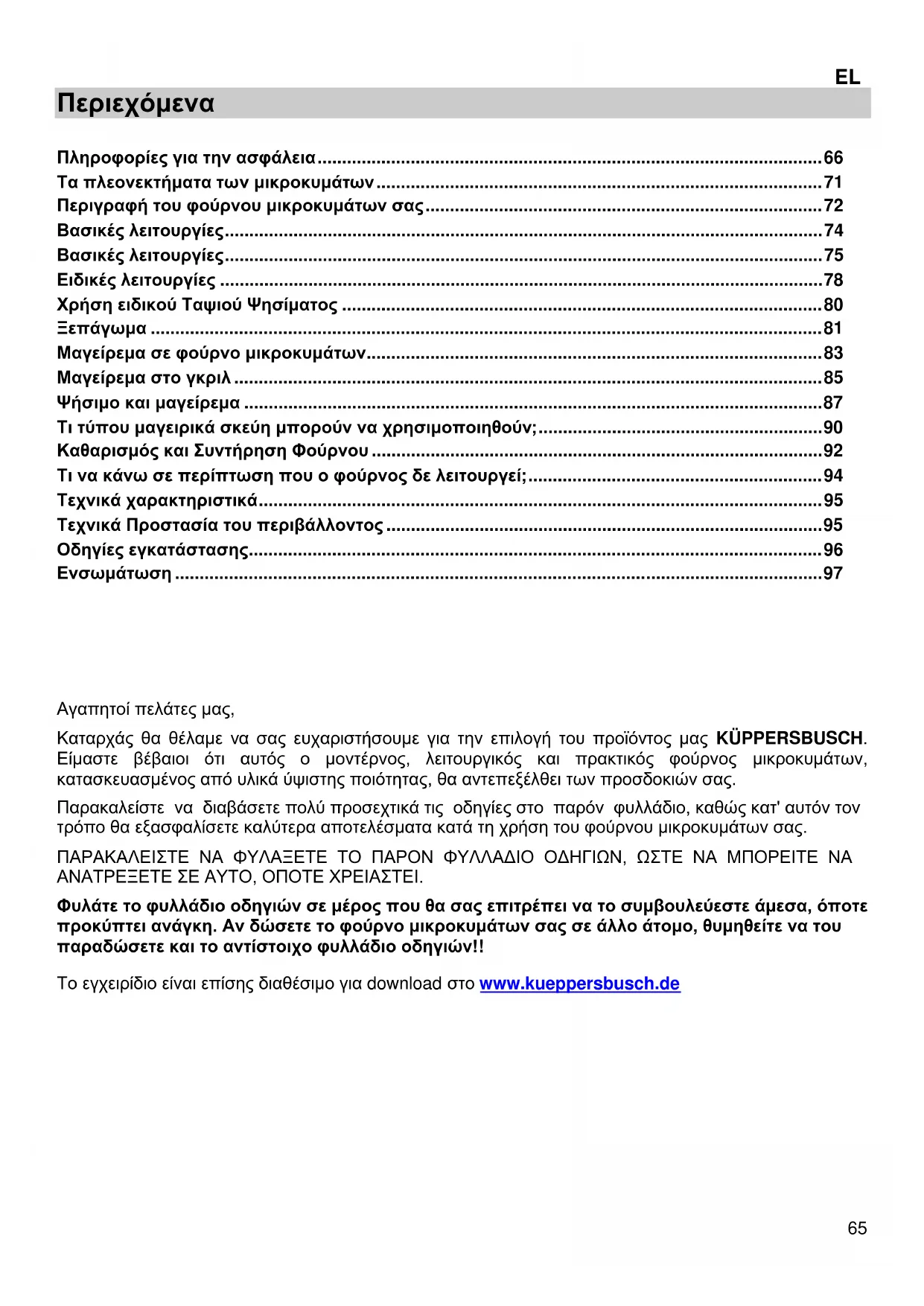 Αγαπητοί πελάτες μας, Καταρχάς θα θέλαμε να σας ευχαριστήσουμε για την επιλογή του προϊόντος μας KÜPPERSBUSCH. Είμαστε βέβαιοι ότι αυτός ο μοντέρνος, λειτουργικός και πρακτικός φούρνος μικροκυμάτων, κατασκευασμένος από υλικά ύψιστης ποιότητας, θα αντεπεξέλθει των προσδοκιών σας. Παρακαλείστε να διαβάσετε πολύ προσεχτικά τις οδηγίες στο παρόν φυλλάδιο, καθώς κατ' αυτόν τον τρόπο θα εξασφαλίσετε καλύτερα αποτελέσματα κατά τη χρήση του φούρνου μικροκυμάτων σας. ΠΑΡΑΚΑΛΕΙΣΤΕ ΝΑ ΦΥΛΑΞΕΤΕ ΤΟ ΠΑΡΟΝ ΦΥΛΛΑΔΙΟ ΟΔΗΓΙΩΝ, ΩΣΤΕ ΝΑ ΜΠΟΡΕΙΤΕ ΝΑ ΑΝΑΤΡΕΞΕΤΕ ΣΕ ΑΥΤΟ, ΟΠΟΤΕ ΧΡΕΙΑΣΤΕΙ. Φυλάτε το φυλλάδιο οδηγιών σε μέρος που θα σας επιτρέπει να το συμβουλεύεστε άμεσα, όποτε προκύπτει ανάγκη. Αν δώσετε το φούρνο μικροκυμάτων σας σε άλλο άτομο, θυμηθείτε να του παραδώσετε και το αντίστοιχο φυλλάδιο οδηγιών!! Το εγχειρίδιο είναι επίσης διαθέσιμο για download στο www.kueppersbusch.de66