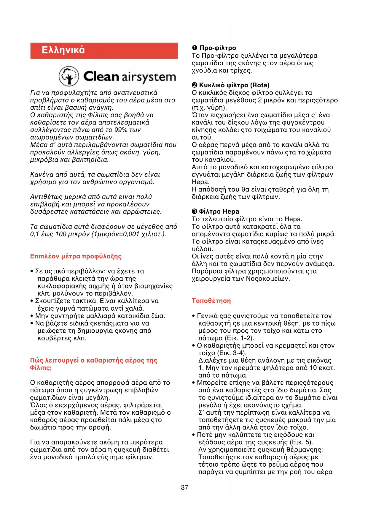 Για να προφυλαχτήτε απ αναπνευστικά προβλήµατα ο καθαρισµς του αέρα µέσα στο σπίτι είναι βασική ανάγκη. O καθαριστής της Φίλιπς σας βοηθά να καθαρίσετε τον αέρα αποτελεσµατικά συλλέγοντας πάνω απ το 99% των αιωρουµένων σωµατιδίων. Mέσα σ’ αυτά περιλαµβάνονται σωµατίδια που προκαλούν αλλεργίες πως σκνη, γύρη, µικρβια και βακτηρίδια. Kανένα απ αυτά, τα σωµατίδια δεν είναι χρήσιµο για τον ανθρώπινο οργανισµ. Aντιθέτως µερικά απ αυτά είναι πολύ επιβλαβή και µπορεί να προκαλέσουν δυσάρεστες καταστάσεις και αρρώστειες. Tα σωµατίδια αυτά διαφέρουν σε µέγεθος απ 0,1 έως 100 µικρν (1µικρν=0,001 χιλιστ.). Eπιπλέον µέτρα προφύλαξης