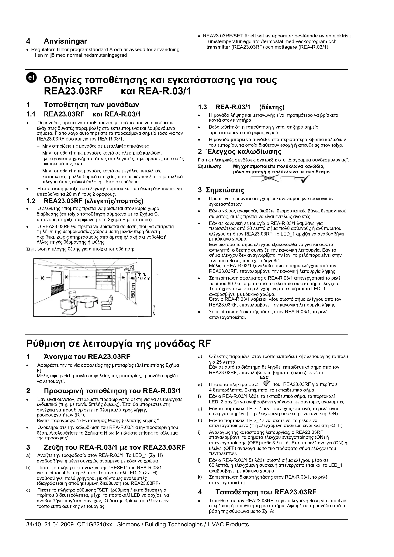- Ο REA23.03RF/SET είναι ένα συγκρότημα διατάξεων, που περιλαμβάνουν ηλεκτρικό ελεγκτή/θερμοστάτη θερμοκρασίας χώρου με εβδομαδιαίο χρονοδιακόπτη, πομπό (REA23.03RF) και δέκτη ραδιοσυχνοτήτων (REA-R.03/1)Siemens / Building Technologies / HVAC Products CE1G2218xx 24.04.2009 37/40 Massbilder Dimensions Encombrements Ingombri Dimensiones Maatschetsen Rozměry Boyutlar Méretek Wymiary Måttuppgifter Διαστάσεις REA23.03RF