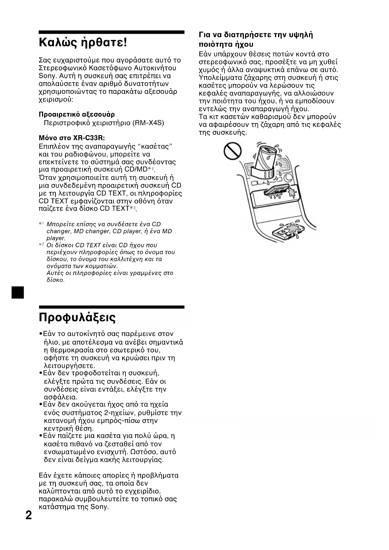 - Εάν παίζετε µια κασέτα για πολύ ώρα, η κασέτα πιθαν να ζεσταθεί απ τον ενσωµατωµένο ενισχυτή. Ωστσο, αυτ δεν είναι δείγµα κακής λειτουργίας. Εάν έχετε κάποιες απορίες ή προβλήµατα µε τη συσκευή σας, τα οποία δεν καλύπτονται απ αυτ το εγχειρίδιο, παρακαλώ συµβουλευτείτε το τοπικ σας κατάστηµα της Sony. Για να διατηρήσετε την υψηλή ποιτητα ήχου Εάν υπάρχουν θέσεις ποτών κοντά στο στερεοφωνικ σας, προσέξτε να µη χυθεί χυµς ή άλλα αναψυκτικά επάνω σε αυτ. Υπολείµµατα ζάχαρης στη συσκευή ή στις κασέτες µπορούν να λερώσουν τις κεφαλές αναπαραγωγής, να αλλοιώσουν την ποιτητα του ήχου, ή να εµποδίσουν εντελώς την αναπαραγωγή ήχου. Τα κιτ κασετών καθαρισµού δεν µπορούν να αφαιρέσουν τη ζάχαρη απ τις κεφαλές της συσκευής.3 Κασέτες µεγαλύτερες απ 90 λεπτά Η χρήση κασετών µεγαλύτερων των 90 λεπτών δε συνιστάται, εκτς απ την περίπτωση συνεχούς αναπαραγωγής µεγάλης διάρκειας. Η ταινία που χρησιµοποιείται σε αυτές τις κασέτες είναι πολύ λεπτή και ξεχειλώνει εύκολα. Το συχν ξεκίνηµα και σταµάτηµα αναπαραγωγής αυτών των κασετών µπορεί να έχει ως αποτέλεσµα την εµπλοκή τους στο µηχανισµ του κασετοφώνου.