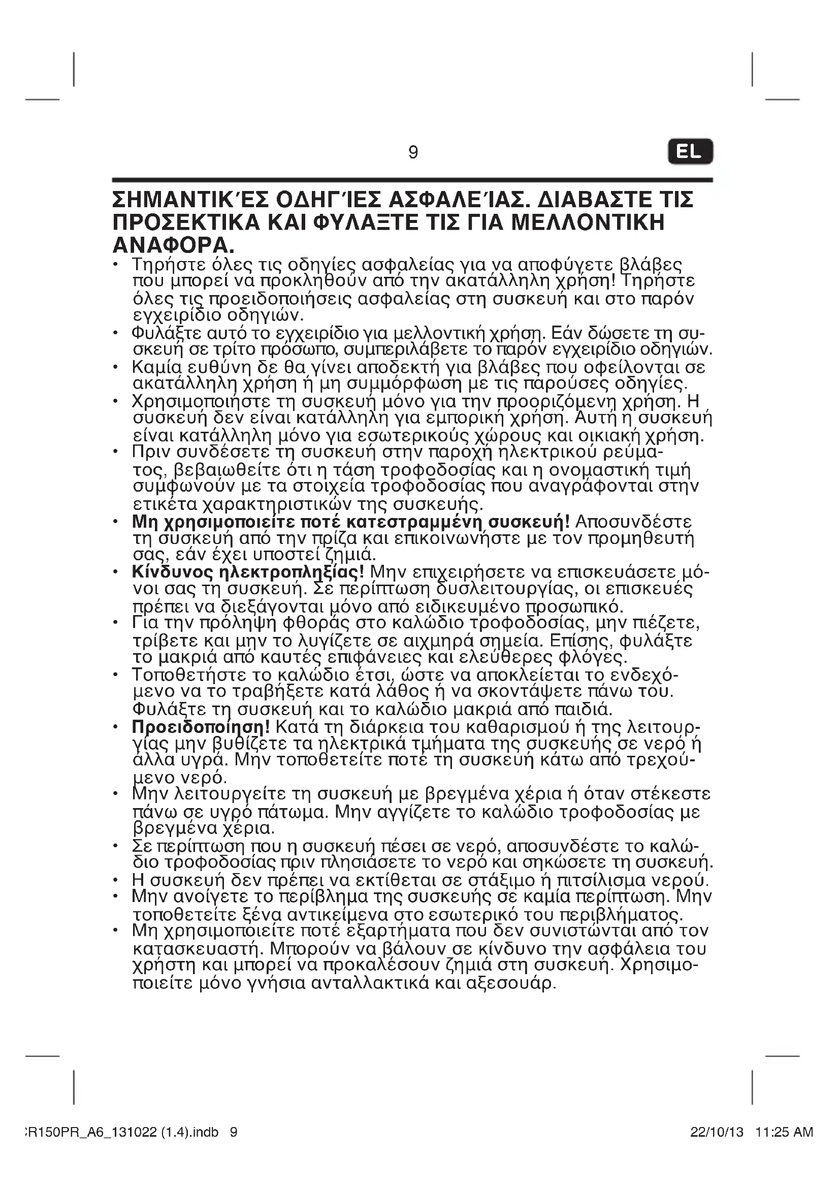 - Μη χρησιμοποιείτε ποτέ εξαρτήματα που δεν συνιστώνται από τον κατασκευαστή. Μπορούν να βάλουν σε κίνδυνο την ασφάλεια του χρήστη και μπορεί να προκαλέσουν ζημιά στη συσκευή. Χρησιμο- ποιείτε μόνο γνήσια ανταλλακτικά και αξεσουάρ. OCR150PR_A6_131022 (1.4).indb 9CR150PR_A6_131022 (1.4).indb 9 22/10/13 11:25 AM22/10/13 11:25 AM10