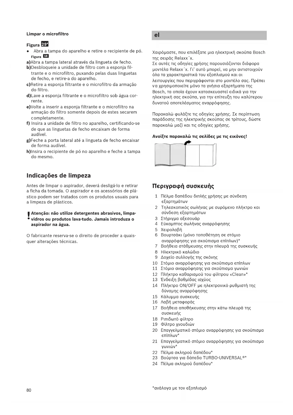 αρακαλώ μαζί και τις οδηγίες χρήσης. Ανοίξτε παρακαλώ τις σελίδες με τις εικόνες! Περιγραφή συσκευής 1 Πέλμα δαπέδου διπλής χρήσης με σύνδεση εξαρτημάτων 2 Τηλεσκοπικός σωλήνας με συρόμενο πλήκτρο και σύνδεση εξαρτημάτων 3 Στήριγμα αξεσουάρ 4 Εύκαμπτος σωλήνας αναρρόφησης 5 Χειρολαβή 6 Βουρτσάκι (μόνο τοποθέτηση σε στόμιο αναρρόφησης για σκούπισμα επίπλων)* 7 Βοήθεια στάθμευσης στην πλευρά της συσκευής 8 Ηλεκτρικό καλώδιο 9 Δοχείο συλλογής της σκόνης 10 Στόμιο αναρρόφησης για σκούπισμα επίπλων 11 Στόμιο αναρρόφησης για σκούπισμα γωνιών 12 Πλήκτρο καθαρισμού του φίλτρου «Clean»* 13 Ένδειξη βαθμίδας ισχύος 14 Πλήκτρο ON/OFF με ηλεκτρονικό ρυθμιστή της δύναμης αναρρόφησης 15 Κάλυμμα συσκευής 16 Λαβή μεταφοράς 17 Βοήθεια αποθήκευσης στην κάτω πλευρά της