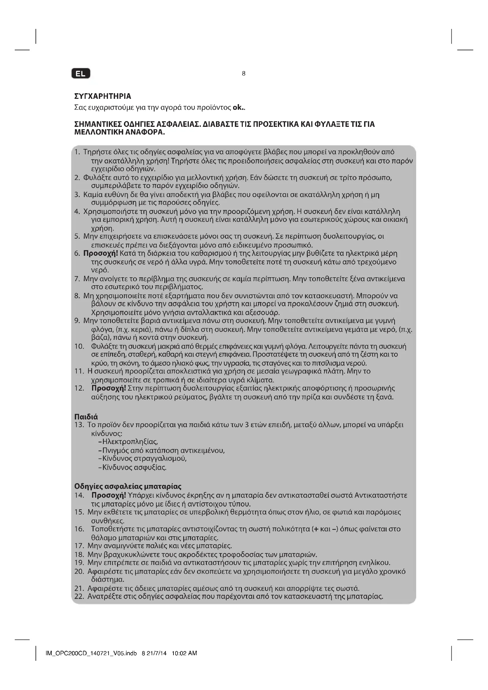 ΣΥΓΧΑΡΗΤΗΡΙΑ Σας ευχαριστούμε για την αγορά του προϊόντος ok.. ΣΗΜΑΝΤΙΚΕΣ ΟΔΗΓΙΕΣ ΑΣΦΑΛΕΙΑΣ. ΔΙΑΒΑΣΤΕ ΤΙΣ ΠΡΟΣΕΚΤΙΚΑ ΚΑΙ ΦΥΛΑΞΤΕ ΤΙΣ ΓΙΑ ΜΕΛΛΟΝΤΙΚΗ ΑΝΑΦΟΡΑ.