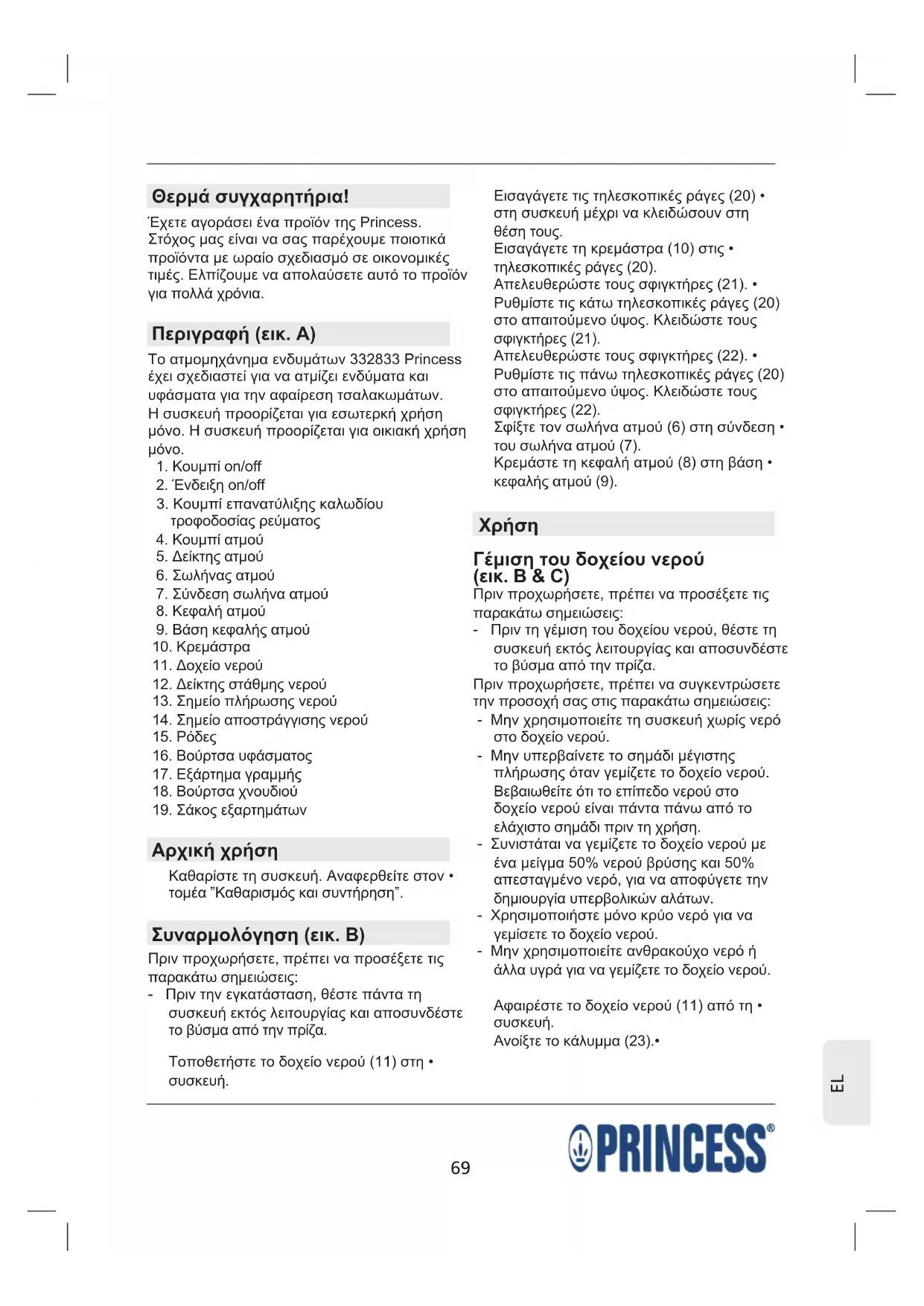 Θερμά συγχαρητήρια! Έχετε αγοράσει ένα προϊόν της Princess. Στόχος μας είναι να σας παρέχουμε ποιοτικά προϊόντα με ωραίο σχεδιασμό σε οικονομικές τιμές. Ελπίζουμε να απολαύσετε αυτό το προϊόν για πολλά χρόνια. Περιγραφή (εικ. A) Το ατμομηχάνημα ενδυμάτων 332833 Princess έχει σχεδιαστεί για να ατμίζει ενδύματα και υφάσματα για την αφαίρεση τσαλακωμάτων. Η συσκευή προορίζεται για εσωτερκή χρήση μόνο. Η συσκευή προορίζεται για οικιακή χρήση
