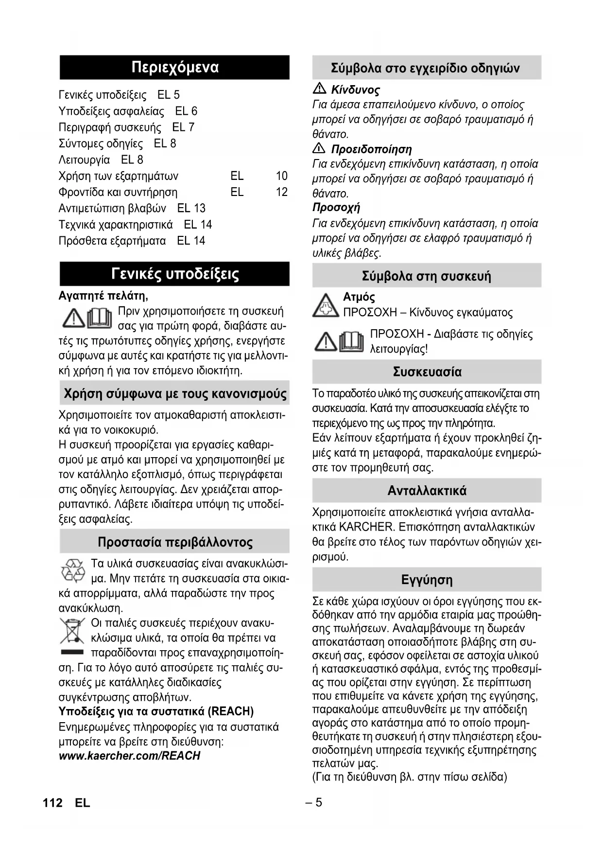 ΠΡΟΣΟΧΗ – Κίνδυνος εγκαύματος ΠΡΟΣΟΧΗ - Διαβάστε τις οδηγίες λειτουργίας! Το παραδοτέο υλικό της συσκευής απεικονίζεται στη συσκευασία. Κατά την αποσυσκευασία ελέγξτε το περιεχόμενο της ως προς την πληρότητα. Εάν λείπουν εξαρτήματα ή έχουν προκληθεί ζη- μιές κατά τη μεταφορά, παρακαλούμε ενημερώ- στε τον προμηθευτή σας. Χρησιμοποιείτε αποκλειστικά γνήσια ανταλλα- κτικά KARCHER. Επισκόπηση ανταλλακτικών θα βρείτε στο τέλος των παρόντων οδηγιών χει-