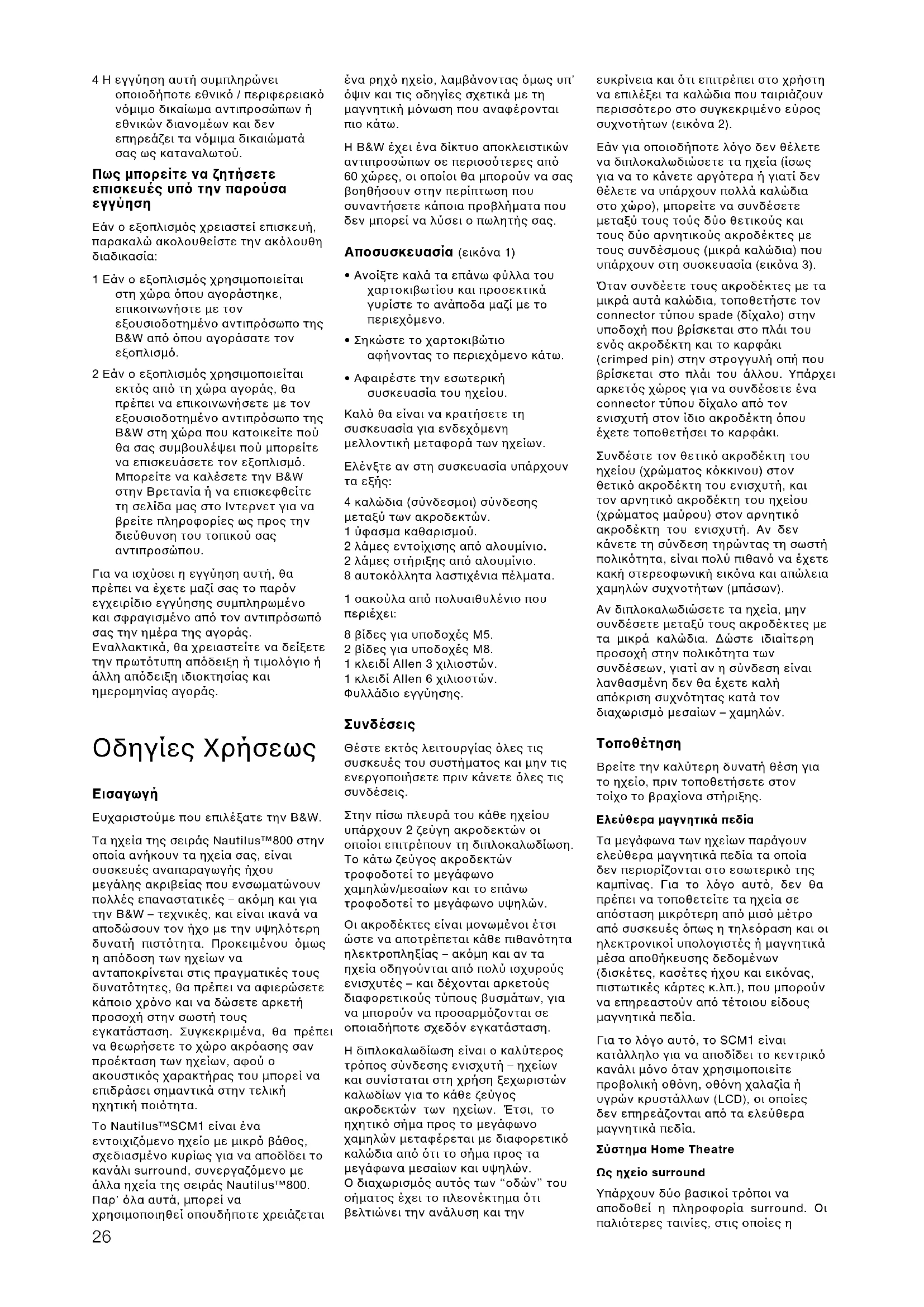 2 Εάν ο εξοπλισµς χρησιµοποιείται εκτς απ τη χώρα αγοράς, θα πρέπει να επικοινωνήσετε µε τον εξουσιοδοτηµένο αντιπρσωπο της B&W στη χώρα που κατοικείτε πού θα σας συµβουλέψει πού µπορείτε να επισκευάσετε τον εξοπλισµ. Μπορείτε να καλέσετε την B&W στην Βρετανία ή να επισκεφθείτε τη σελίδα µας στο Ιντερνετ για να βρείτε πληροφορίες ως προς την διεύθυνση του τοπικού σας αντιπροσώπου. Για να ισχύσει η εγγύηση αυτή, θα πρέπει να έχετε µαζί σας το παρν εγχειρίδιο εγγύησης συµπληρωµένο και σφραγισµένο απ τον αντιπρσωπ σας την ηµέρα της αγοράς. Εναλλακτικά, θα χρειαστείτε να δείξετε την πρωττυπη απδειξη ή τιµολγιο ή άλλη απδειξη ιδιοκτησίας και ηµεροµηνίας αγοράς. Οδηγίες Χρήσεως