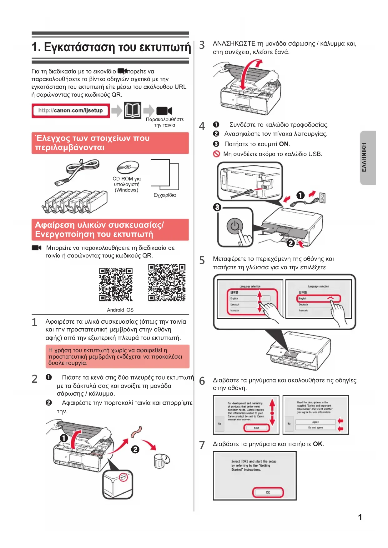 Για τη διαδικασία με το εικονίδιο , μπορείτε να παρακολουθήσετε τα βίντεο οδηγιών σχετικά με την εγκατάσταση του εκτυπωτή είτε μέσω του ακόλουθου URL ή σαρώνοντας τους κωδικούς QR. Παρακολουθήστε την ταινία Έλεγχος των στοιχείων που περιλαμβάνονται CD-ROM για υπολογιστή (Windows)Εγχειρίδια Αφαίρεση υλικών συσκευασίας/ Ενεργοποίηση του εκτυπωτή Μπορείτε να παρακολουθήσετε τη διαδικασία σε ταινία ή σαρώνοντας τους κωδικούς QR. Android iOS