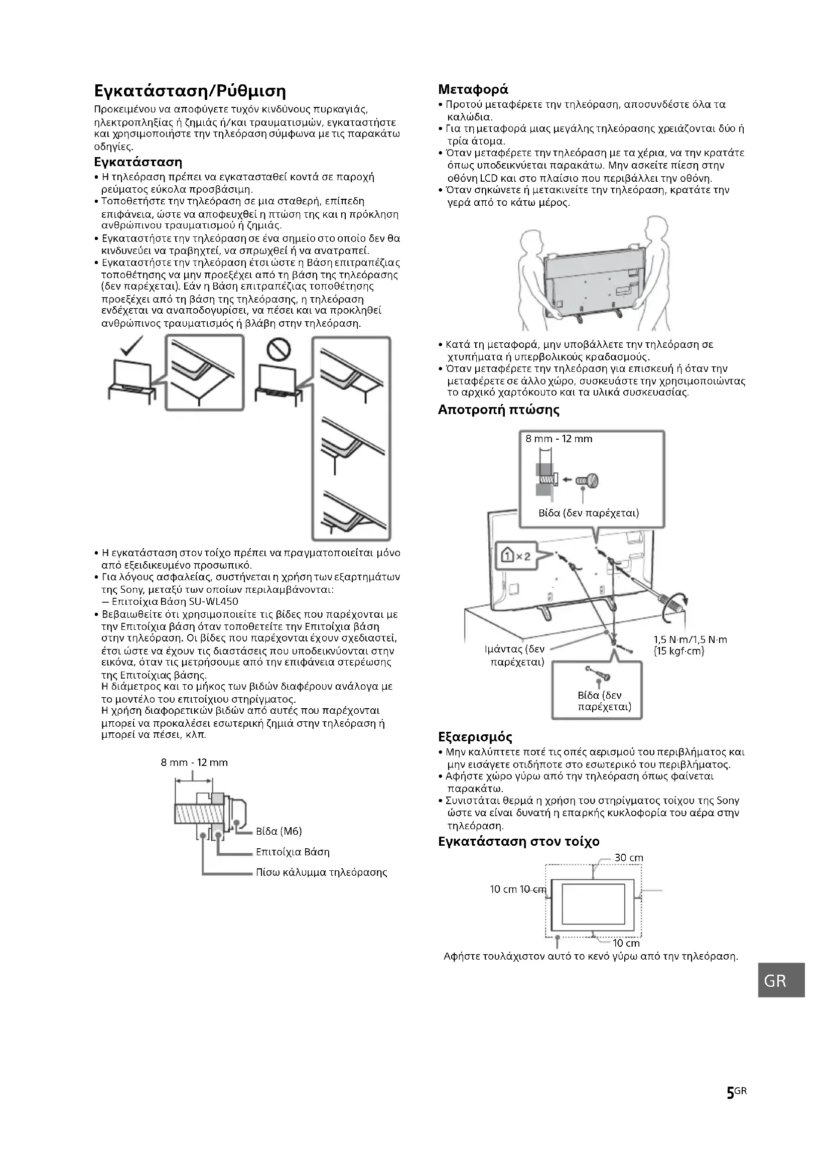 D:\Sony TV_ME\SY17_KF_EU_RG_121\18_4684583121_GR\030ADD_GR.fm masterpage: Left KD-55XE83xx / 55XE80xx / 49XE83xx / 49XE80xx / 43XE83xx / 43XE80xx / FW-55XE80xx / 49XE80xx / 43XE80xx 4-684-583-12(1) Εγκατάσταση της τηλεόρασης στον τοίχο Το εγχειρίδιο οδηγιών αυτής της τηλεόρασης παρουσιάζει μόνο τα βήματα για την προετοιμασία της εγκατάστασης της τηλεόρασης πριν από την εγκατάσταση στον τοίχο. Προς τους πελάτες: Για λόγους προστασίας και ασφάλειας του προϊόντος, η Sony συνιστά ένθερμα η εγκατάσταση της τηλεόρασής σας να πραγματοποιείται από αντιπροσώπους της Sony ή εξουσιοδοτημένους τεχνικούς. Μην επιχειρήσετε να την εγκαταστήσετε μόνοι σας. Προς τους αντιπροσώπους της Sony και τους τεχνικούς: Δώστε μεγάλη προσοχή στην ασφάλεια κατά την εγκατάσταση, την περιοδική συντήρηση και τον έλεγχο του προϊόντος αυτού. Χρησιμοποιήστε την Επιτοίχια Βάση SU-WL450 (δεν παρέχεται), για να εγκαταστήσετε την τηλεόραση στον τοίχο. Κατά την εγκατάσταση της Επιτοίχιας βάσης, συμβουλευτείτε επίσης τις Οδηγίες Χρήσης και τον Οδηγό εγκατάστασης που συνοδεύουν την Επιτοίχια βάση.