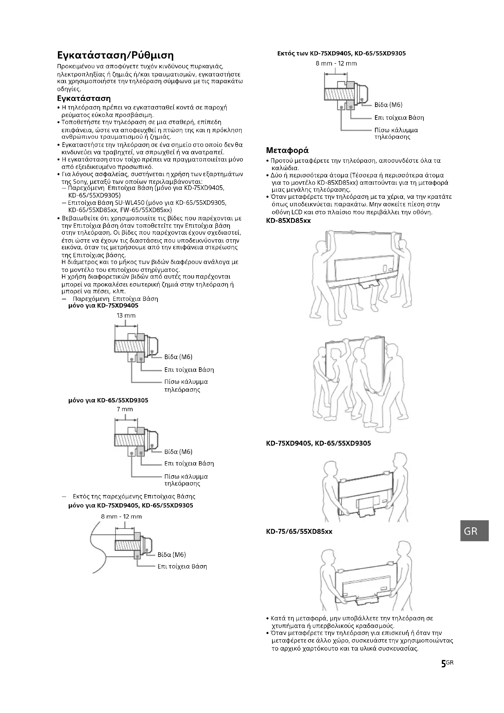 - Βεβαιωθείτε ότι ο τοίχος έχει αρκετό χώρο και για την τηλεόραση μπορεί να στηρίξει βάρος τουλάχιστον τέσσερις φορές μεγαλύτερο από αυτό της τηλεόρασης. Ανατρέξτε στη σελίδα 28-30 (Τεχνικά χαρακτηριστικά) για το βάρος της τηλεόρασης. Για οδηγίες σχετικά με την εγκατάσταση της Επιτοίχιας Βάσης του μοντέλου της τηλεόρασής σας, ανατρέξτε στον Οδηγό εγκατάστασης της Επιτοίχιας Βάσης που παρέχεται. Χρήση της Επιτοίχιας Βάσης που παρέχεται (μόνο για KD-75XD9405, KD-65/55XD9305) Προς τους πελάτες Για την εγκατάσταση αυτού του προϊόντος απαιτείται επαρκής τεχνογνωσία. Αναθέστε την εγκατάσταση του προϊόντος σε αντιπροσώπους της Sony ή εξουσιοδοτημένους τεχνικούς και προσέξτε ιδιαίτερα τις προφυλάξεις ασφάλειας κατά τη διάρκεια της εγκατάστασης. Η Sony δεν φέρει ευθύνη για τυχόν ζημιές ή τραυματισμούς που οφείλονται σε κακό χειρισμό ή λανθασμένη εγκατάσταση ή εγκατάσταση προϊόντος άλλου από το καθορισμένο. Τα νόμιμα δικαιώματά σας (εάν υπάρχουν) δεν επηρεάζονται. Προς τους αντιπροσώπους της Sony και τους τεχνικούς Για την εγκατάσταση αυτού του προϊόντος απαιτείται επαρκής τεχνογνωσία. Διαβάστε προσεκτικά το παρόν εγχειρίδιο οδηγιών, έτσι ώστε να εκτελέσετε τις εργασίες εγκατάστασης με ασφάλεια. Η Sony δεν φέρει ευθύνη για τυχόν ζημιές ή τραυματισμούς που οφείλονται σε κακό χειρισμό ή λανθασμένη εγκατάσταση.19