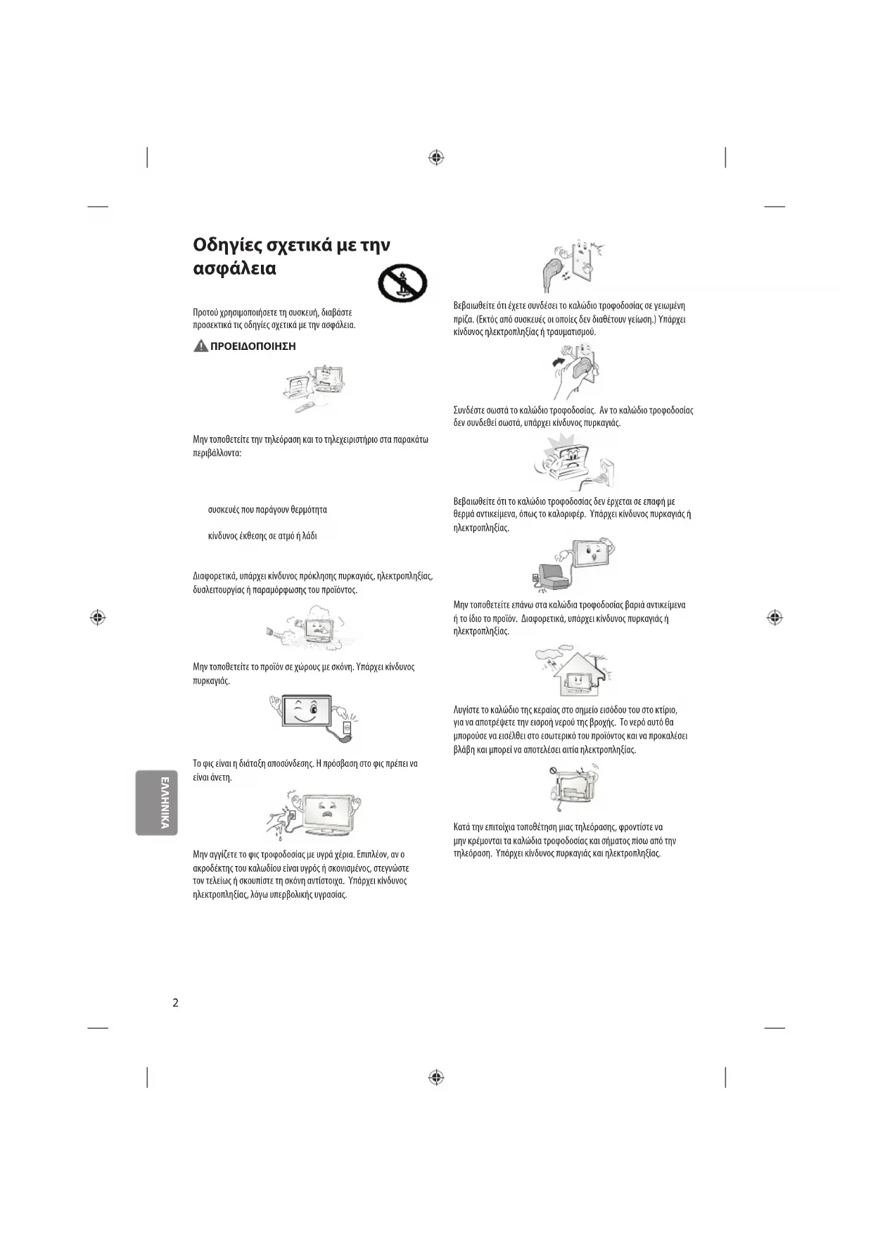 Μην συνδέετε μεγάλο αριθμό ηλεκτρικών συσκευών σε ένα πολύπριζο. Υπάρχει κίνδυνος πρόκλησης πυρκαγιάς λόγω υπερθέρμανσης. Προσέξτε να μην ρίξετε κάτω το προϊόν και μην το αφήσετε να πέσει κατά τη σύνδεση εξωτερικών συσκευών. Σε μια τέτοια περίπτωση, υπάρχει κίνδυνος τραυματισμού ή πρόκλησης ζημιάς στο προϊόν. Desiccant Μην αφήνετε το αφυγραντικό μέσο ή τα πλαστικά υλικά συσκευασίας σε μέρη όπου έχουν πρόσβαση παιδιά. Το αφυγραντικό μέσο είναι επιβλαβές σε περίπτωση κατάποσης. Αν καταποθεί κατά λάθος, προκαλέστε εμετό και μεταβείτε στο πλησιέστερο νοσοκομείο. Επίσης, τα υλικά συσκευασίας μπορεί να προκαλέσουν ασφυξία. Μην τα αφήνετε σε μέρη όπου έχουν πρόσβαση παιδιά. Μην αφήνετε τα παιδιά σας να σκαρφαλώνουν ή να κρέμονται από την τηλεόραση. Η τηλεόραση μπορεί να πέσει και να προκαλέσει σοβαρό τραυματισμό. Να απορρίπτετε τις χρησιμοποιημένες μπαταρίες με ασφάλεια, για να αποφύγετε τον κίνδυνο κατάποσής τους από τα παιδιά. Σε περίπτωση κατάποσης μπαταρίας, αναζητήστε αμέσως τη συμβουλή γιατρού. Μην εισάγετε αγώγιμα υλικά (όπως μεταλλικά αντικείμενα) στη μία άκρη του καλωδίου τροφοδοσίας, όταν η άλλη άκρη είναι συνδεδεμένη στην πρίζα παροχής ηλεκτρικού ρεύματος. Επιπλέον, μην αγγίξετε το καλώδιο τροφοδοσίας, μόλις το συνδέσετε στην πρίζα. Υπάρχει κίνδυνος ηλεκτροπληξίας. (Ανάλογα με το μοντέλο) Μην τοποθετείτε και μην αποθηκεύετε εύφλεκτες ουσίες κοντά στο προϊόν. Υπάρχει κίνδυνος έκρηξης ή πυρκαγιάς, λόγω λανθασμένης χρήσης των εύφλεκτων ουσιών. Μην ρίχνετε μεταλλικά αντικείμενα, όπως κέρματα, μεταλλικά τσιμπιδάκια, σύρματα, ή εύφλεκτα υλικά, όπως χαρτί και σπίρτα, μέσα στο προϊόν. Τα παιδιά πρέπει να είναι ιδιαίτερα προσεκτικά. Μπορεί να προκληθεί ηλεκτροπληξία, πυρκαγιά ή τραυματισμός. Εάν κάποιο αντικείμενο πέσει μέσα στο προϊόν, αποσυνδέστε το καλώδιο τροφοδοσίας και επικοινωνήστε με το κέντρο τεχνικής εξυπηρέτησης. Μην ψεκάζετε νερό στο προϊόν και μην το τρίβετε με εύφλεκτες ουσίες (διαλυτικό ή βενζίνη). Υπάρχει κίνδυνος πυρκαγιάς ή ηλεκτροπληξίας. Μην προκαλείτε ισχυρούς κραδασμούς στο προϊόν και μην αφήνετε αντικείμενα να πέφτουν πάνω του. Επίσης, μην ρίχνετε αντικείμενα επάνω στην οθόνη. Ενδέχεται να τραυματιστείτε ή να υποστεί ζημιά
