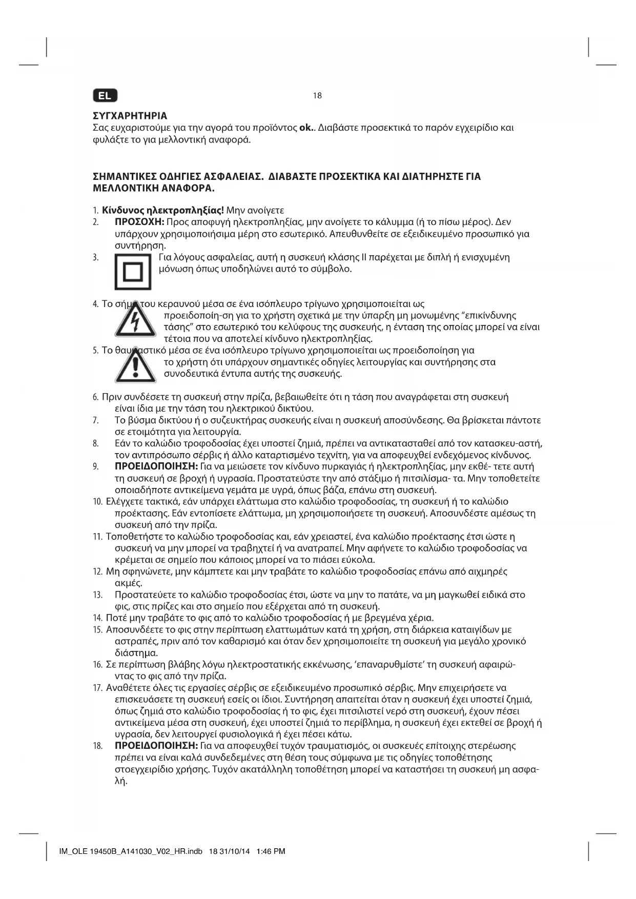 - Παρακαλώ ανατρέξτε στην κατωτέρω ιστοσελίδα για λεπτομερείς τεχνικές πληροφορίες ή επικοινωνήστε με τον κατασκευαστή για την τεχνική τεκμηρίωση: www.ok-online.com IM_OLE 19450B_A141030_V02_HR.indb 31 31/10/14 1:46 PM32