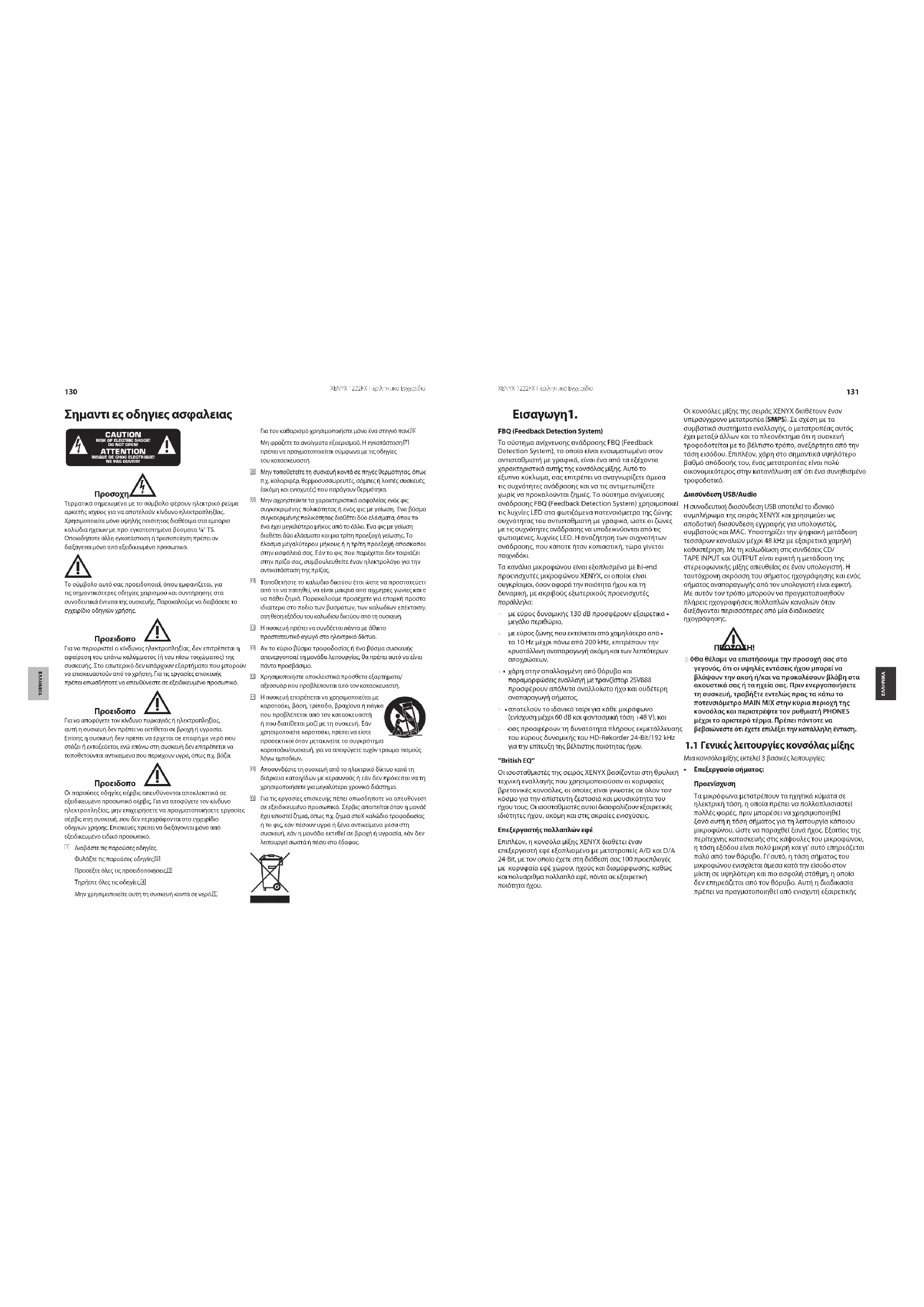 Σηαντι ε οδηγιε ασφαλεια Εισαγωγη1. FBQ (Feedback Detection System)Το σύστημα ανίχνευσης ανάδρασης FBQ (Feedback Detection System), το οποίο είναι ενσωματωμένο στον αντισταθμιστή με γραφικά, είναι ένα από τα εξέχοντα χαρακτηριστικά αυτής της κονσόλας μίξης. Αυτό το έξυπνο κύκλωμα, σας επιτρέπει να αναγνωρίζετε άμεσα τις συχνότητες ανάδρασης και να τις αντιμετωπίζετε χωρίς να προκαλούνται ζημιές. Το σύστημα ανίχνευσης ανάδρασης FBQ (Feedback Detection System) χρησιμοποιεί τις λυχνίες LED στα φωτιζόμενα ποτενσιόμετρα της ζώνης συχνότητας του αντισταθμιστή με γραφικά, ώστε οι ζώνες με τις συχνότητες ανάδρασης να υποδεικνύονται από τις φωτισμένες, λυχνίες LED. Η αναζήτηση των συχνοτήτων ανάδρασης, που κάποτε ήταν κοπιαστική, τώρα γίνεται παιχνιδάκι.Τα κανάλια μικροφώνου είναι εξοπλισμένα με hi-end προενισχυτές μικροφώνου XENYX, οι οποίοι είναι συγκρίσιμοι, όσον αφορά την ποιότητα ήχου και τη δυναμική, με ακριβούς εξωτερικούς προενισχυτές παράλληλα:με εύρος δυναμικής 130 dB προσφέρουν εξαιρετικά •μεγάλο περιθώριο,με εύρος ζώνης που εκτείνεται από χαμηλότερα από •τα 10 Hz μέχρι πάνω από 200 kHz, επιτρέπουν την κρυστάλλινη αναπαραγωγή ακόμη και των λεπτότερων αποχρώσεων,χάρη στην απαλλαγμένη από θόρυβο και •παραμορφώσεις εναλλαγή με τρανζίστορ 2SV888 προσφέρουν απόλυτα αναλλοίωτο ήχο και ουδέτερη αναπαραγωγή σήματος,αποτελούν το ιδανικό ταίρι για κάθε μικρόφωνο •(ενίσχυση μέχρι 60 dB και φαντασμική τάση +48 V), καισας προσφέρουν τη δυνατότητα πλήρους εκμετάλλευσης •του εύρους δυναμικής του HD-Rekorder 24-Bit/192 kHz για την επίτευξη της βέλτιστης ποιότητας ήχου.“British EQ”Οι ισοσταθμιστές της σειράς XENYX βασίζονται στη θρυλική τεχνική εναλλαγής που χρησιμοποιούσαν οι κορυφαίες βρετανικές κονσόλες, οι οποίες είναι γνωστές σε όλον τον κόσμο για την απίστευτη ζεστασιά και μουσικότητα του ήχου τους. Οι ισοσταθμιστές αυτοί διασφαλίζουν εξαιρετικές ιδιότητες ήχου, ακόμη και στις ακραίες ενισχύσεις. Επεξεργαστή πολλαπλών εφέΕπιπλέον, η κονσόλα μίξης XENYX διαθέτει έναν επεξεργαστή εφέ εξοπλισμένο με μετατροπείς A/D και D/A 24-Bit, με τον οποίο έχετε στη διάθεσή σας 100 προεπιλογές με κορυφαία εφέ χώρου, ηχούς και διαμόρφωσης, καθώς και πολυάριθμα πολλαπλά εφέ, πάντα σε εξαιρετική ποιότητα ήχου.Οι κονσόλες μίξης της σειράς XENYX διαθέτουν έναν υπερσύγχρονο μετατροπέα (SMPS). Σε σχέση με τα συμβατικά συστήματα εναλλαγής, ο μετατροπέας αυτός έχει μεταξύ άλλων και το πλεονέκτημα ότι η συσκευή τροφοδοτείται με το βέλτιστο τρόπο, ανεξάρτητα από την τάση εισόδου. Επιπλέον, χάρη στο σημαντικά υψηλότερο βαθμό απόδοσής του, ένας μετατροπέας είναι πολύ οικονομικότερος στην κατανάλωση απ’ ότι ένα συνηθισμένο τροφοδοτικό.∆ιασύνδεση USB/AudioΗ συνοδευτική διασύνδεση USB αποτελεί το ιδανικό συμπλήρωμα της σειράς XENYX και χρησιμεύει ως αποδοτική διασύνδεση εγγραφής για υπολογιστές, συμβατούς και MAC. Υποστηρίζει την ψηφιακή μετάδοση τεσσάρων καναλιών μέχρι 48 kHz με εξαιρετικά χαμηλή καθυστέρηση. Με τη καλωδίωση στις συνδέσεις CD/TAPE INPUT και OUTPUT είναι εφικτή η μετάδοση της στερεοφωνικής μίξης απευθείας σε έναν υπολογιστή. Η ταυτόχρονη ακρόαση του σήματος ηχογράφησης και ενός σήματος αναπαραγωγής από τον υπολογιστή είναι εφικτή. Με αυτόν τον τρόπο μπορούν να πραγματοποιηθούν πλήρεις ηχογραφήσεις πολλαπλών καναλιών όταν διεξάγονται περισσότερες από μία διαδικασίες ηχογράφησης. Θα θέλαμε να επιστήσουμε την προσοχή σας στο ◊ γεγονός