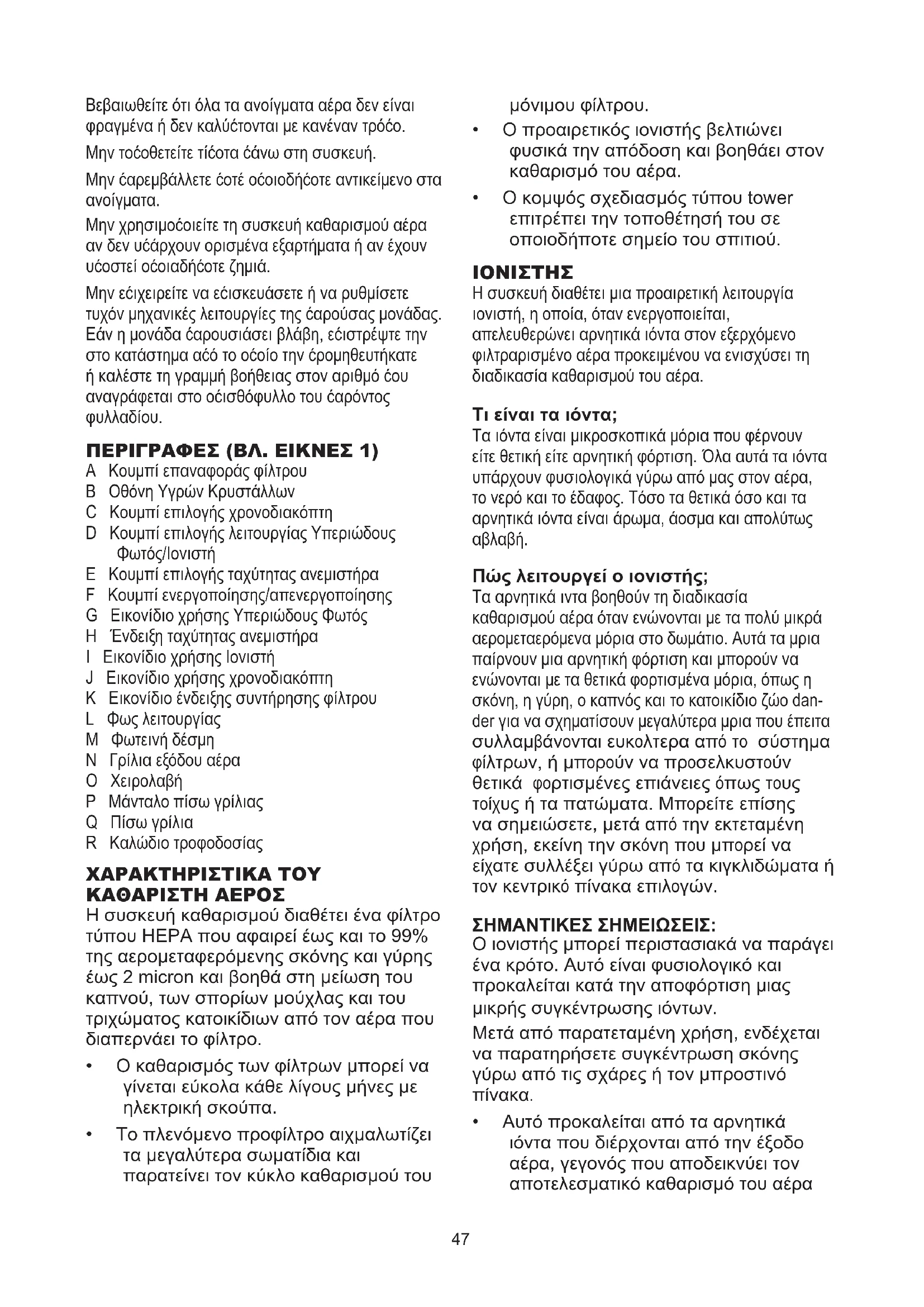 ΠΕΡΙΓΡΑΦΕΣ (ΒΛ. ΕΙΚΝΕΣ 1) A Κουμπί επαναφοράς φίλτρου B Οθόνη Υγρών Κρυστάλλων C Κουμπί επιλογής χρονοδιακόπτη D Κουμπί επιλογής λειτουργίας Υπεριώδους Φωτός/Ιονιστή E Κουμπί επιλογής ταχύτητας ανεμιστήρα F Κουμπί ενεργοποίησης/απενεργοποίησης G Εικονίδιο χρήσης Υπεριώδους Φωτός H Ένδειξη ταχύτητας ανεμιστήρα I Εικονίδιο χρήσης Ιονιστή J Εικονίδιο χρήσης χρονοδιακόπτη K Εικονίδιο ένδειξης συντήρησης φίλτρου L Φως λειτουργίας M Φωτεινή δέσμη N Γρίλια εξόδου αέρα O Χειρολαβή P Μάνταλο πίσω γρίλιας Q Πίσω γρίλια R Καλώδιο τροφοδοσίας ΧΑΡΑΚΤΗΡΙΣΤΙΚΑ ΤΟΥ ΚΑΘΑΡΙΣΤΗ ΑΕΡΟΣ Ησυσκευήκαθαρισμούδιαθέτειέναφίλτρο τύπουHEPAπουαφαιρείέωςκαιτο99% τηςαερομεταφερόμενηςσκόνηςκαιγύρης έως2micronκαιβοηθάστημείωσητου καπνού,τωνσπορίωνμούχλαςκαιτου τριχώματοςκατοικίδιωναπότοναέραπου διαπερνάειτοφίλτρο.