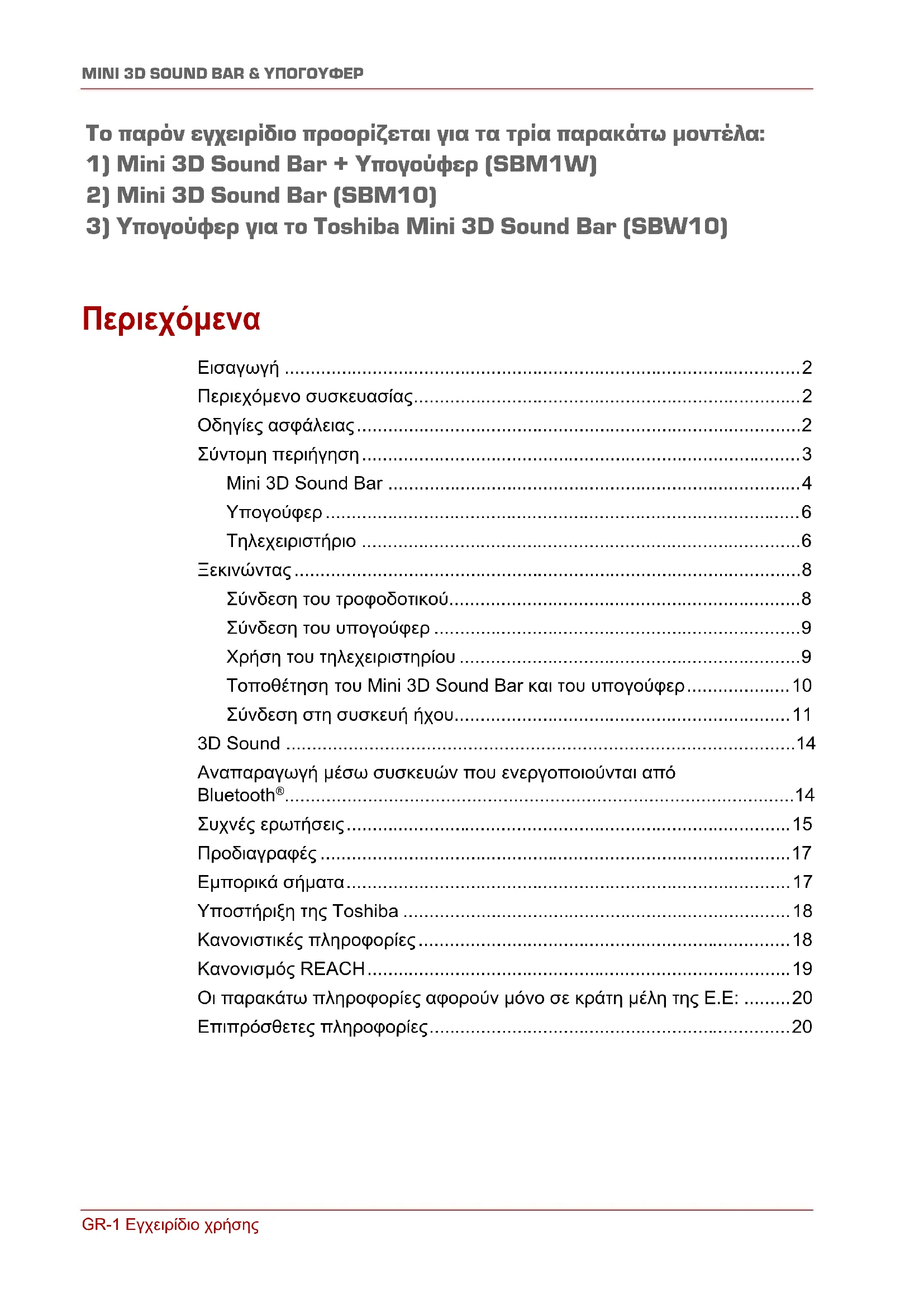 3) Υπογούφερ για το Toshiba Mini 3D Sound Bar (SBW10)Εγχειρίδιο χρήσης GR-2