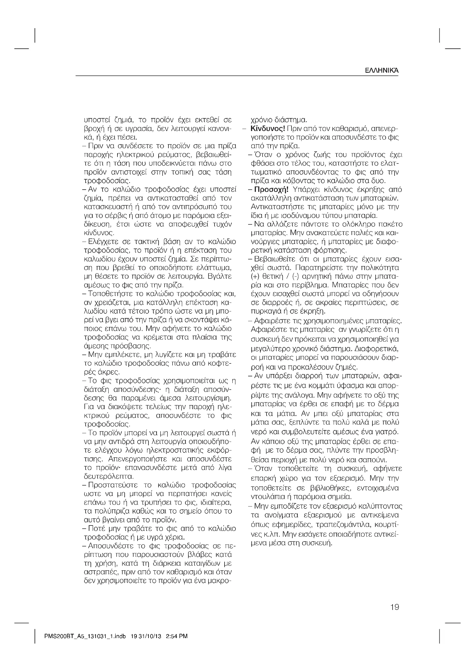 – Το φις τροφοδοσίας χρησιμοποιείται ως η διάταξη αποσύνδεσης· η διάταξη αποσύν- δεσης θα παραμένει άμεσα λειτουργίσιμη. Για να διακόψετε τελείως την παροχή ηλε- κτρικού ρεύματος, αποσυνδέστε το φις τροφοδοσίας. – Το προϊόν μπορεί να μη λειτουργεί σωστά ή να μην αντιδρά στη λειτουργία οποιουδήπο- τε ελέγχου λόγω ηλεκτροστατικής εκφόρ- τισης. Απενεργοποιήστε και αποσυνδέστε το προϊόν· επανασυνδέστε μετά από λίγα δευτερόλεπτα. – Προστατεύστε το καλώδιο τροφοδοσίας ωστε να μη μπορεί να περπατήσει κανείς επάνω του ή να τρυπήσει το φις, ιδιαίτερα, τα πολύπριζα καθώς και το σημείο όπου το αυτό βγαίνει από το προϊόν. – Ποτέ μην τραβάτε το φις από το καλώδιο τροφοδοσίας ή με υγρά χέρια. – Αποσυνδέστε το φις τροφοδοσίας σε πε- ρίπτωση που παρουσιαστούν βλάβες κατά τη χρήση, κατά τη διάρκεια καταιγίδων με αστραπές, πριν από τον καθαρισμό και όταν δεν χρησιμοποιείτε το προϊόν για ένα μακρο- χρόνιο διάστημα. – Κίνδυνος! Πριν από τον καθαρισμό, απενερ- γοποιήστε το προϊόν και αποσυνδέστε το φις από την πρίζα. – Όταν ο χρόνος ζωής του προϊόντος έχει φθάσει στο τέλος του, καταστήστε το ελατ- τωματικό αποσυνδέοντας το φις από την πρίζα και κόβοντας το καλώδιο στα δυο. – Προσοχή! Υπάρχει κίνδυνος έκρηξης από ακατάλληλη αντικατάσταση των μπαταριών. Αντικαταστήστε τις μπαταρίες μόνο με την ίδια ή με ισοδύναμου τύπου μπαταρία. – Να αλλάζετε πάντοτε το ολόκληρο πακέτο μπαταρίας. Μην ανακατεύετε παλιές και και- νούργιες μπαταρίες, ή μπαταρίες με διαφο- ρετική κατάσταση φόρτισης. – Βεβαιωθείτε ότι οι μπαταρίες έχουν εισα- χθεί σωστά. Παρατηρείστε την πολικότητα (+) θετική / (-) αρνητική πάνω στην μπατα- ρία και στο περίβλημα. Μπαταρίες που δεν έχουν εισαχθεί σωστά μπορεί να οδηγήσουν σε διαρροές ή, σε ακραίες περιπτώσεις, σε πυρκαγιά ή σε έκρηξη. – Αφαιρέστε τις χρησιμοποιημένες μπαταρίες. Αφαιρέστε τις μπαταρίες αν γνωρίζετε ότι η συσκευή δεν πρόκειται να χρησιμοποιηθεί για μεγαλύτερο χρονικό διάστημα. Διαφορετικά, οι μπαταρίες μπορεί να παρουσιάσουν διαρ- ροή και να προκαλέσουν ζημιές. – Αν υπάρξει διαρροή των μπαταριών, αφαι- ρέστε τις με ένα κομμάτι ύφασμα και απορ- ρίψτε της ανάλογα. Μην αφήνετε το οξύ της μπαταρίας να έρθει σε επαφή με το δέρμα και τα μάτια. Αν μπει οξύ μπαταρίας στα μάτια σας, ξεπλύντε τα πολύ καλά με πολύ νερό και συμβολευτείτε αμέσως ένα γιατρό. Αν κάποιο οξύ της μπαταρίας έρθει σε επα- φή με το δέρμα σας, πλύντε την προσβλη- θείσα περιοχή με πολύ νερό και σαπούνι. – Όταν τοποθετείτε τη συσκευή, αφήνετε επαρκή χώρο για τον εξαερισμό. Μην την τοποθετείτε σε βιβλιοθήκες, εντοιχισμένα ντουλάπια ή παρόμοια σημεία. – Μην εμποδίζετε τον εξαερισμό καλύπτοντας τα ανοίγματα εξαερισμού με αντικείμενα όπως εφημερίδες, τραπεζομάντιλα, κουρτί- νες κ.λπ. Μην εισάγετε οποιαδήποτε αντικεί- μενα μέσα στη συσκευή. PMS200BT_A5_131031_1.indb 19 31/10/13 2:54 PMΕΛΛΗΝΙΚΆ
