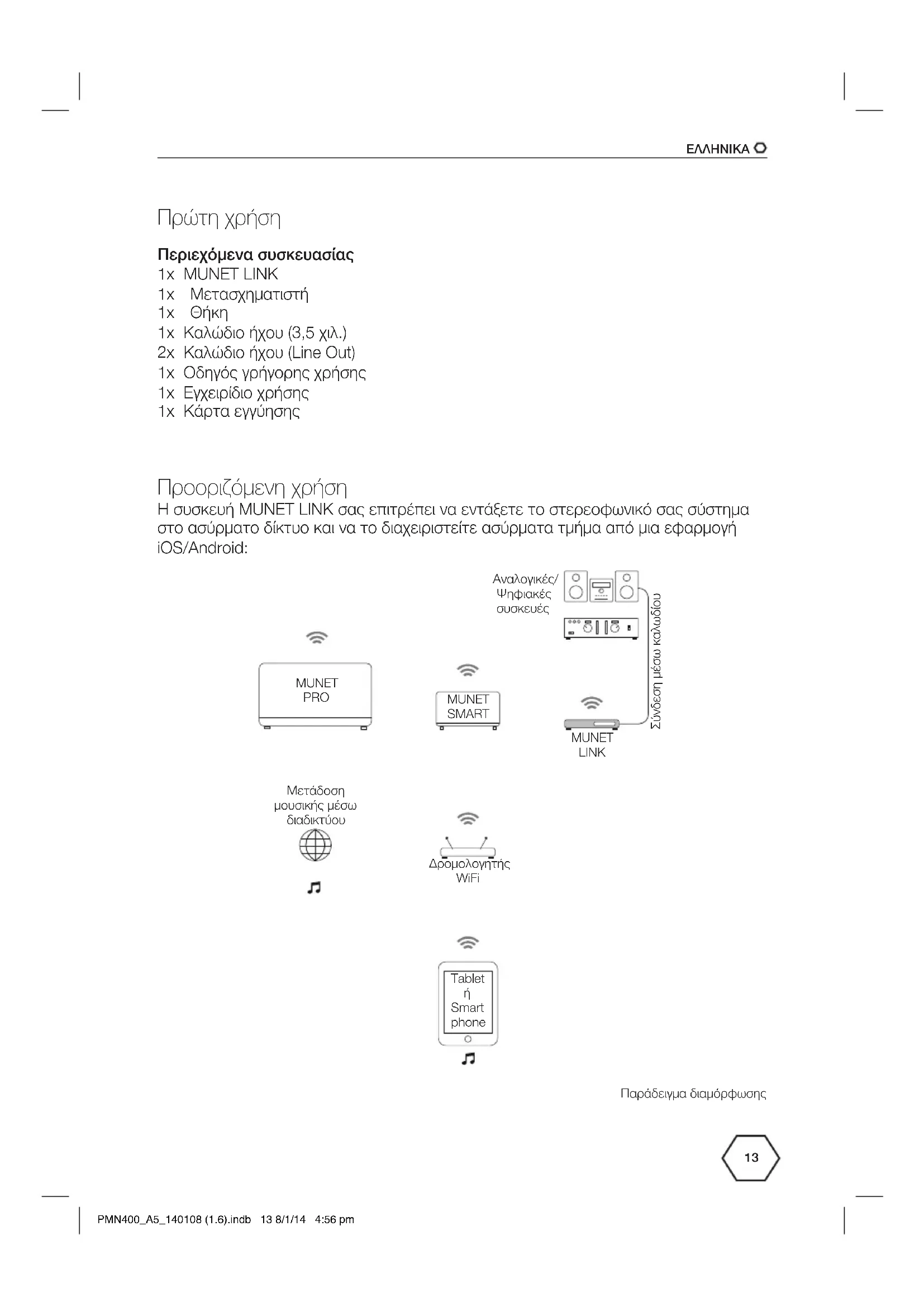 Πρώτη χρήση Περιεχόμενα συσκευασίας 1x MUNET LINK 1x Μετασχηματιστή 1x Θήκη 1x Καλώδιο ήχου (3,5 χιλ.) 2x Καλώδιο ήχου (Line Out) 1x Οδηγός γρήγορης χρήσης 1x Εγχειρίδιο χρήσης 1x Κάρτα εγγύησης Προοριζόμενη χρήση Η συσκευή MUNET LINK σας επιτρέπει να εντάξετε το στερεοφωνικό σας σύστημα στο ασύρματο δίκτυο και να το διαχειριστείτε ασύρματα τμήμα από μια εφαρμογή iOS/Android: Tablet