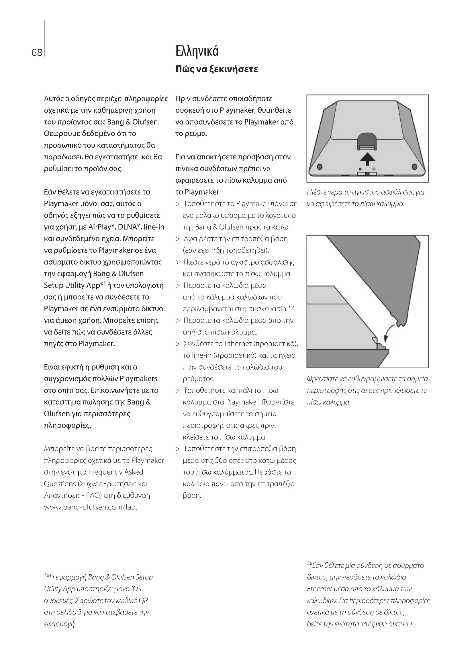 As especicações técnicas, as funcionalidades e a respectiva utilização estão sujeitas a alterações sem aviso prévio.Ελληνικά Αυτός ο οδηγός περιέχει πληροφορίες σχετικά με την καθημερινή χρήση του προϊόντος σας Bang& Olufsen. Θεωρούμε δεδομένο ότι το προσωπικό του καταστήματος θα παραδώσει, θα εγκαταστήσει και θα ρυθμίσει το προϊόν σας. Εάν θέλετε να εγκαταστήσετε το Playmaker μόνοι σας, αυτός ο οδηγός εξηγεί πώς να το ρυθμίσετε για χρήση με AirPlay®, DLNA®, line-in και συνδεδεμένα ηχεία. Μπορείτε να ρυθμίσετε το Playmaker σε ένα ασύρματο δίκτυο χρησιμοποιώντας την εφαρμογή Bang& Olufsen Setup Utility App*