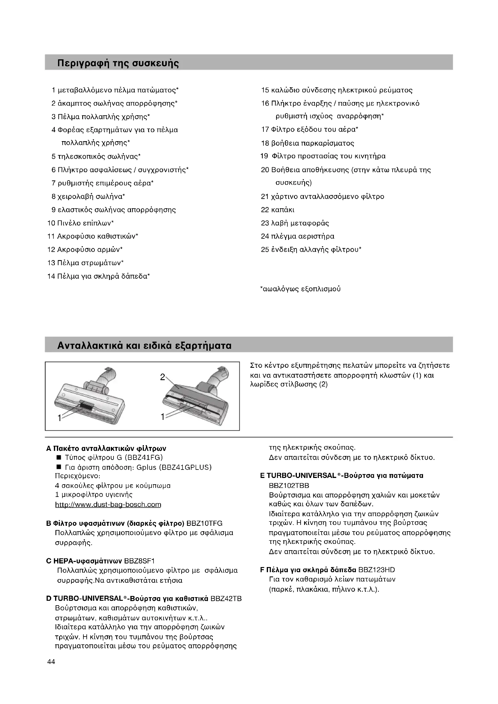-Βούρτσα για πατώµατα BBZ102TBB Βούρτσισµα και απορρφηση χαλιών και µοκετών καθώς και λων των δαπέδων. Ιδιαίτερα κατάλληλο για την απορρφηση ζωικών τριχών. Η κίνηση του τυµπάνου της βούρτσας πραγµατοποιείται µέσω του ρεύµατος απορρφησης της ηλεκτρικής σκούπας. ∆εν απαιτείται σύνδεση µε το ηλεκτρικ δίκτυο. F Πέλµα για σκληρά δάπεδα BBZ123HD Για τον καθαρισµ λείων πατωµάτων (παρκέ, πλακάκια, πήλινο κ.τ.λ.).Χαιρόµαστε που επιλέξατε µια ηλεκτρική σκούπα Bosch της σειράς BSA. Σε αυτές τις οδηγίες χρήσης περιγράφονται διάφορα µοντέλα BSA. Γι’ αυτό µπορεί, να µην αντιστοιχούν όλα τα περιγραφόµενα χαρακτηριστικά και όλες οι λειτουργίες στο δικό σας µοντέλο. Πρέπει να χρησιµοποιείτε µόνο τα γνήσια αξεσουάρ και εξαρτήµατα της Bosch, τα οποία έχουν εξελιχθεί ειδικά για την ηλεκτρική σας σκούπα, για να πετύχετε το καλύτερο δυνατό αποτέλεσµα αναρρόφησης. Παρακαλώ φυλάξτε τις οδηγίες χρήσης. Σε περίπτωση παράδοσης της ηλεκτρικής σκούπας σε τρίτους, δώστε παρακαλώ µαζί και τις οδηγίες χρήσης. Χρήση σύµφωνα µε το σκοπό προορισµού Αυτή η ηλεκτρική σκούπα προορίζεται για χρήση µόνο στο σπίτι και όχι για επαγγελµατικούς σκοπούς. Χρησιµοποιείτε την ηλεκτρική σκούπα αποκλειστικά σύµφωνα µε τα στοιχεία σ’ αυτές τις οδηγίες χρήσης. Ο κατασκευαστής δεν ευθύνεται για ενδεχόµενες ζηµιές, που οφείλονται σε µη ενδεδειγµένη χρήση ή σε λάθος χειρισµό. Γι’ αυτό προσέξτε οπωσδήποτε τις ακόλουθες υποδείξεις! Η ηλεκτρική σκούπα επιτρέπεται να χρησιµοποιείται µόνο