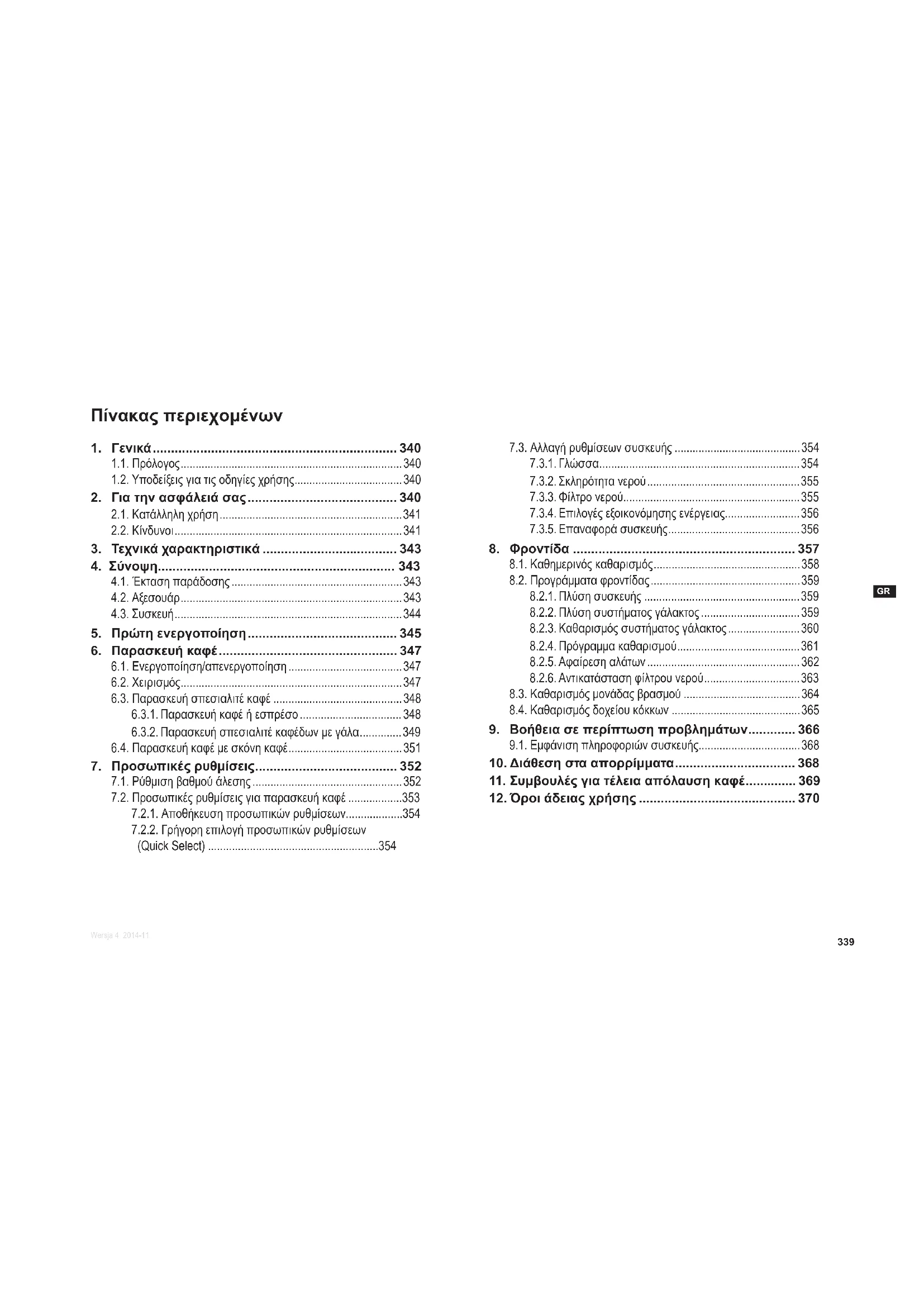 7.1. Ρύθμιση βαθμού άλεσης ..................................................352 7.2. Προσωπικές ρυθμίσεις για παρασκευή καφέ ..................353