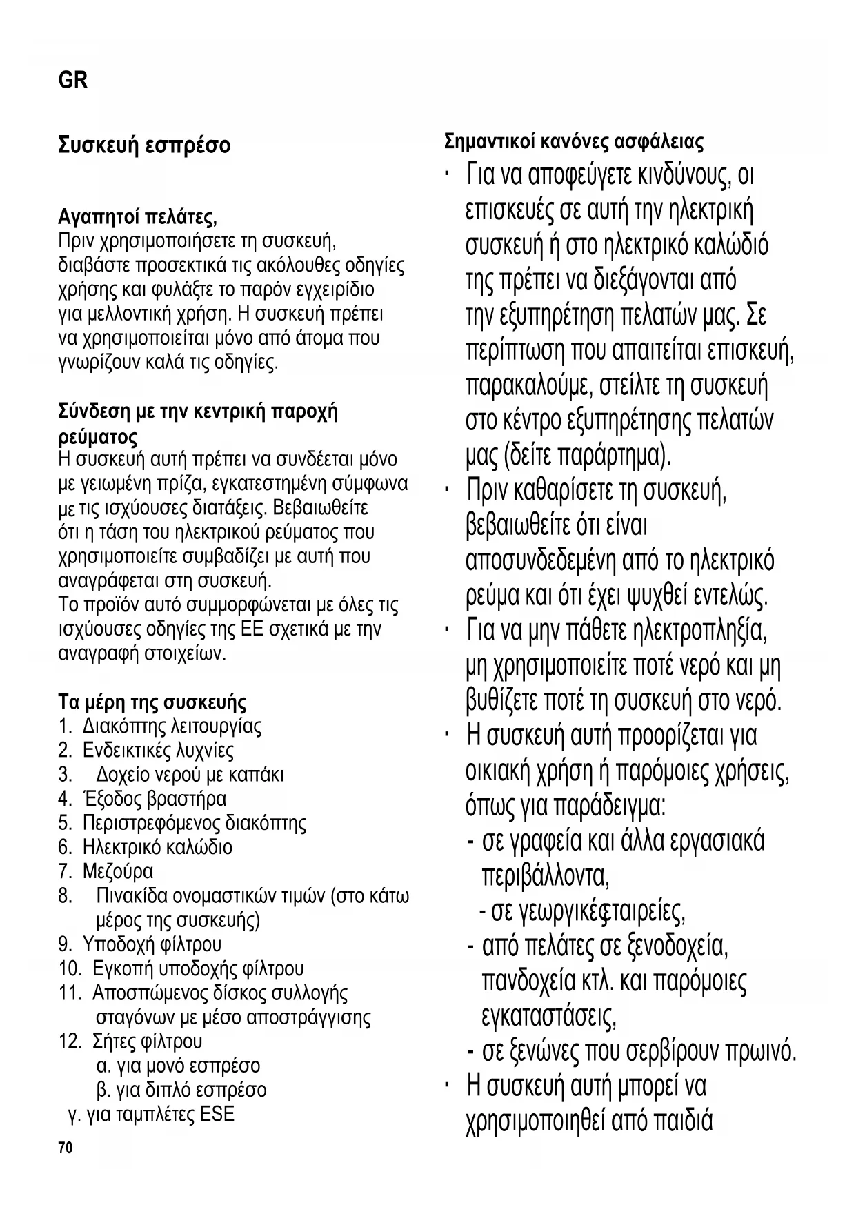α. για μονό εσπρέσο β. για διπλό εσπρέσο γ. για ταμπλέτες ESE Σημαντικοί κανόνες ασφάλειας ∙ Για να αποφεύγετε κινδύνους, οι επισκευές σε αυτή την ηλεκτρική συσκευή ή στο ηλεκτρικό καλώδιό της πρέπει να διεξάγονται από την εξυπηρέτηση πελατών μας. Σε περίπτωση που απαιτείται επισκευή, παρακαλούμε, στείλτε τη συσκευή στο κέντρο εξυπηρέτησης πελατών μας (δείτε παράρτημα). ∙ Πριν καθαρίσετε τη συσκευή, βεβαιωθείτε ότι είναι αποσυνδεδεμένη από το ηλεκτρικό ρεύμα και ότι έχει ψυχθεί εντελώς. ∙ Για να μην πάθετε ηλεκτροπληξία, μη χρησιμοποιείτε ποτέ νερό και μη βυθίζετε ποτέ τη συσκευή στο νερό. ∙ Η συσκευή αυτή προορίζεται για οικιακή χρήση ή παρόμοιες χρήσεις, όπως για παράδειγμα: - σε γραφεία και άλλα εργασιακά περιβάλλοντα, - σε γεωργικές