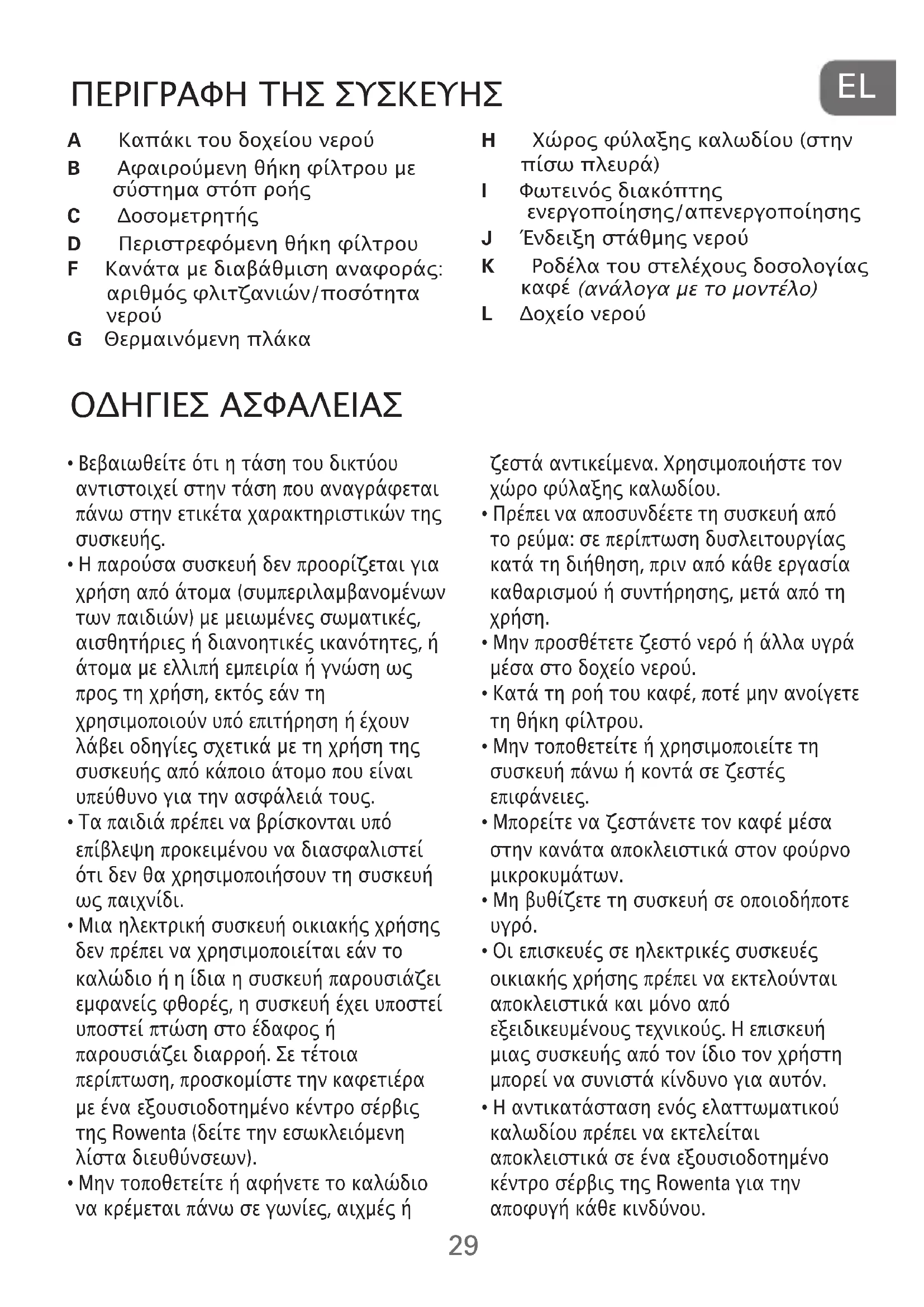 H Χώρος φύλαξης καλωδίου (στηνπίσω πλευρά)I Φωτεινός διακόπτης ενεργοποίησης/απενεργοποίησηςJ Ένδειξη στάθμης νερούK Ροδέλα του στελέχους δοσολογίαςκαφέ (ανάλογα με το μοντέλο) L Δοχείο νερούA Καπάκι του δοχείου νερού B Αφαιρούμενη θήκη φίλτρου με σύστημα στόπ ροής C Δοσομετρητής D Περιστρεφόμενη θήκη φίλτρου F Κανάτα με διαβάθμιση αναφοράς:αριθμός φλιτζανιών/ποσότητανερούG Θερμαινόμενη πλάκα ζεστά αντικείμενα. Χρησιμοποιήστε τον χώρο φύλαξης καλωδίου.