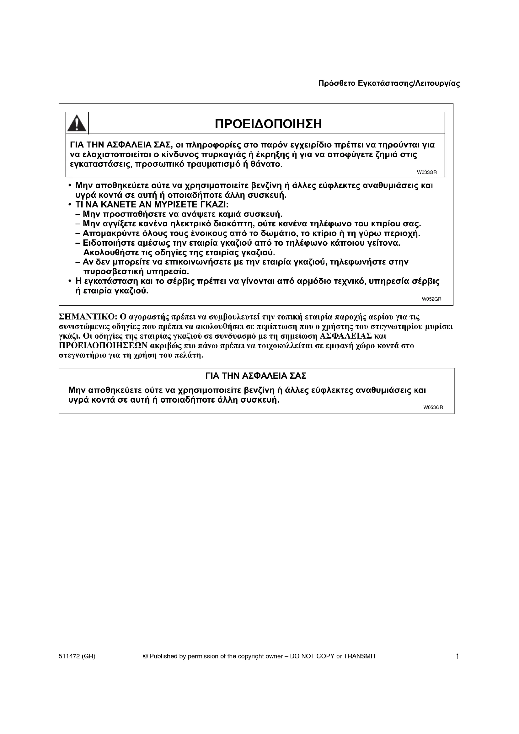 του Κώδικα National Fuel Gas Code ANSI Z223.1. W238GR ΠΡΟΕΙΔΟΠΟΙΗΣΗ 1© Published by permission of the copyright owner – DO NOT COPY or TRANSMIT Πρόσθετο Εγκατάστασης/Λειτουργίας 511472 (GR)