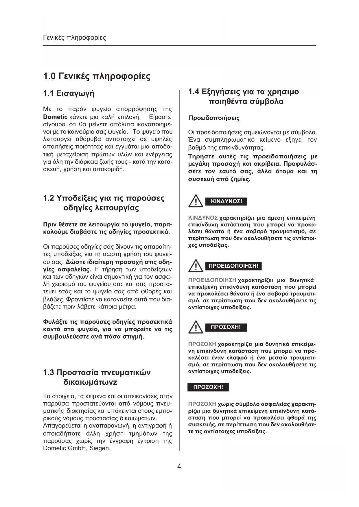 οδηγίες λειτουργίας Προειδοποιήσεις Τα στοιχεία, τα κείμενα και οι απεικονίσεις στην παρούσα προστατεύονται από νόμους πνευ- ματικής ιδιοκτησίας και υπόκεινται στους εμπο- ρικούς νόμους προστασίας δικαιωμάτων. Απαγορεύεται η αναπαραγωγή, η αντιγραφή ή οποιαδήποτε άλλη χρήση τμημάτων της παρούσας χωρίς την έγγραφη έγκριση της Dometic GmbH, Siegen.