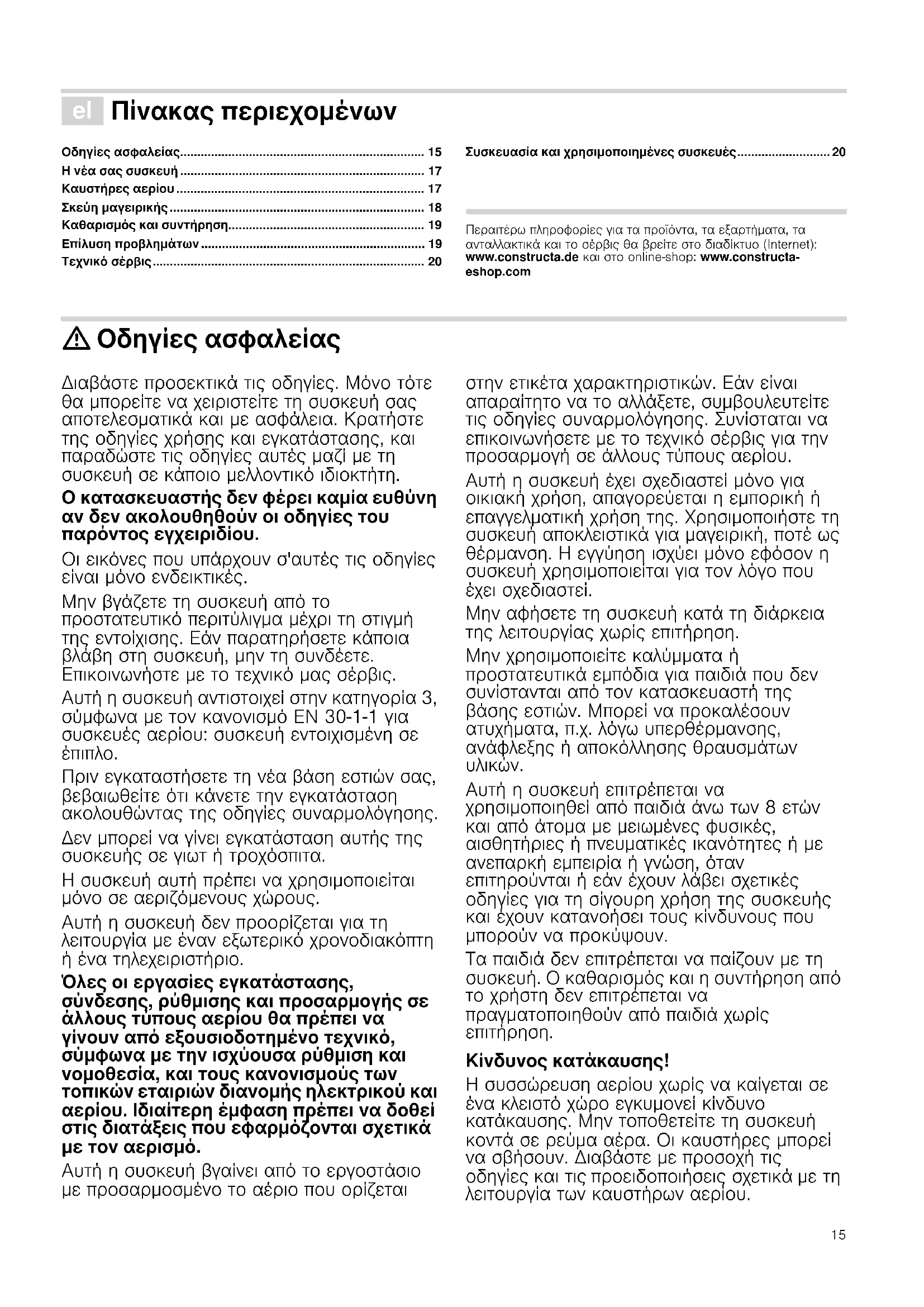 Κίνδυνος κατάκαυσης! Η συσσώρευση αερίου χωρίς να καίγεται σε ένα κλειστό χώρο εγκυμονεί κίνδυνο κατάκαυσης. Μην τοποθετείτε τη συσκευή κοντά σε ρεύμα αέρα. Οι καυστήρες μπορεί να σβήσουν. Διαβάστε με προσοχή τις οδηγίες και τις προειδοποιήσεις σχετικά με τη λειτουργία των καυστήρων αερίου.16 Κίνδυνος δηλητηρίασης! Η χρήση μιας συσκευής αερίου παράγει θερμότητα, υγρασία και προϊόντα καύσης στο μέρος που εγκαθίσταται. Διασφαλίστε ένα καλό εξαερισμό στο χώρο της κουζίνας, ειδικά ενώ λειτουργεί η βάση εστιών: να διατηρείτε ανοιχτά τα ανοίγματα φυσικού εξαερισμού, ή εγκαταστήστε μια συσκευή μηχανικού εξαερισμού (απορροφητήρας). Η έντονη και παρατεταμένη χρήση της συσκευής μπορεί να χρειάζεται ένα συμπληρωματικό ή ένα πιο αποτελεσματικό σύστημα εξαερισμού. ανοίξτε το παράθυρο ή αυξήστε την ισχύ του μηχανικού εξαερισμού. Κίνδυνος εγκαυμάτων! Οι εστίες και τα κοντινά στοιχεία θερμαίνονται πολύ. Ποτέ μην αγγίζετε τις θερμές επιφάνειες. Μακριά από παιδιά κάτω των 8 χρονών. Κίνδυνος πυρκαγιάς!