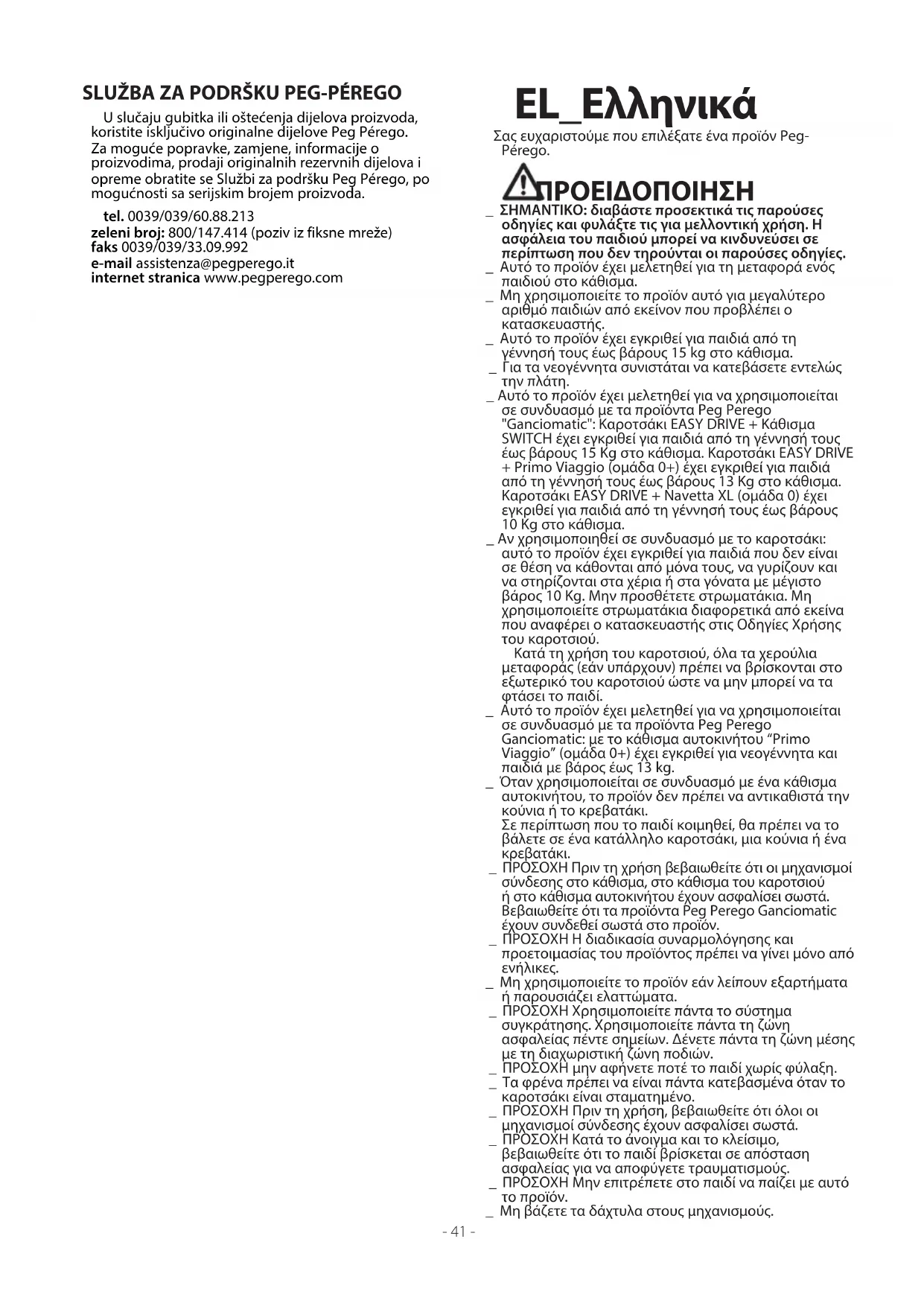 _ Μη βάζετε τα δάχτυλα στους μηχανισμούς. SLUŽBA ZA PODRŠKU PEG-PÉREGO U slučaju gubitka ili oštećenja dijelova proizvoda, koristite isključivo originalne dijelove Peg Pérego. Za moguće popravke, zamjene, informacije o proizvodima, prodaji originalnih rezervnih dijelova i opreme obratite se Službi za podršku Peg Pérego, po mogućnosti sa serijskim brojem proizvoda. tel. 0039/039/60.88.213 zeleni broj: 800/147.414 (poziv iz fiksne mreže) faks 0039/039/33.09.992 e-mail assistenza@pegperego.it internet stranica www.pegperego.com- 42 - _ Προσέξτε το παιδί όταν ρυθμίζετε τους μηχανισμούς (χειρολαβή, πλάτη). _ Κάθε φορτίο που κρέμεται από τη χειρολαβή ή στα χερούλια μπορεί να προκαλέσει αστάθεια. Τηρείτε τις οδηγίες του κατασκευαστή σχετικά με τα μέγιστα επιτρεπτά φορτία. _ Η προστατευτική μπάρα δεν έχει μελετηθεί για να αντέχει στο βάρος του παιδιού. Η προστατευτική μπάρα δεν έχει μελετηθεί για να συγκρατεί το παιδί στο κάθισμα και δεν αντικαθιστά τη ζώνη ασφαλείας. _ Μην τοποθετείτε στο καλάθι φορτία βάρους άνω των 5 kg. Μην τοποθετείτε στην υποδοχή ποτηριών βάρος μεγαλύτερο από το αναγραφόμενο στο εξάρτημα και ποτέ ζεστά ροφήματα. Μην τοποθετείτε στις τσέπες της κουκούλας (εάν υπάρχει) βάρος άνω των 0.2 Kg. _ Μη χρησιμοποιείτε το προϊόν κοντά σε σκάλες ή σκαλοπάτια, εστίες θερμότητας, ακάλυπτες φλόγες ή επικίνδυνα αντικείμενα στα οποία μπορεί να φτάσει το