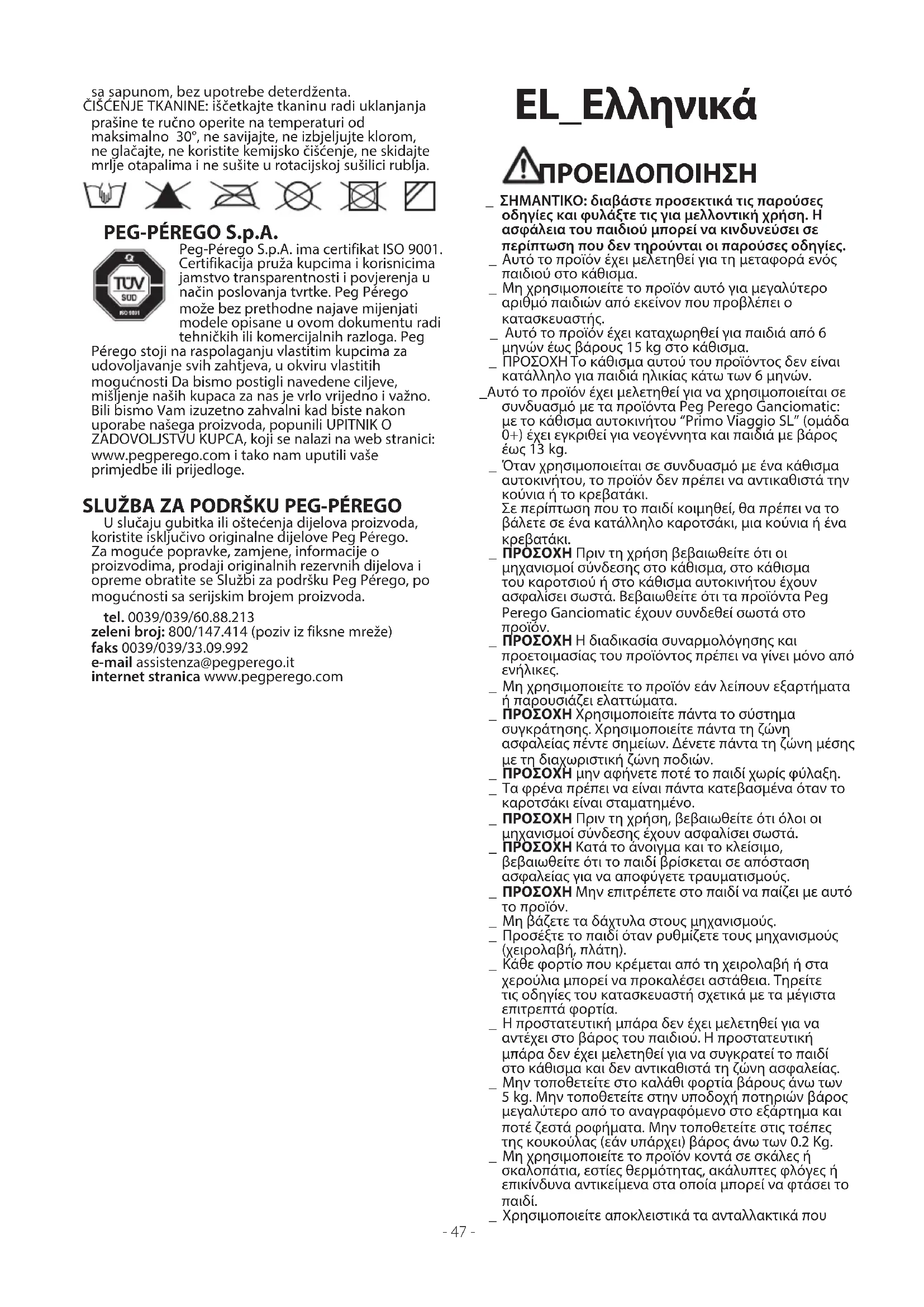 ΚΑΘΑΡΙΣΜΟΣ ΤΟΥ ΣΚΕΛΕΤΟΥ: Περιοδικά καθαρίζετε τα πλαστικά μέρη με ένα υγρό πανί χωρίς να χρησιμοποιείτε διαλυτικά ή άλλα παρόμοια προϊόντα· κρατήστε στεγνά όλα τα μεταλλικά μέρη για να μη σκουριάσουν· κρατήστε καθαρά όλα τα κινούμενα μέρη (μηχανισμοί ρύθμισης, μηχανισμοί σύνδεσης, τροχοί…) από σκόνη ή άμμο και εάν χρειαστεί, λιπάνετέ τα με ελαφρύ λάδι. ΚΑΘΑΡΙΣΜΟΣ ΤΟΥ ΠΡΟΣΤΑΤΕΥΤΙΚΟΥ ΚΑΛΥΜΜΑΤΟΣ ΓΙΑ ΤΗ ΒΡΟΧΗ: πλύνετε με ένα σφουγγάρι και σαπουνισμένο νερό, χωρίς τη χρήση απορρυπαντικών. ΚΑΘΑΡΙΣΜΟΣ ΤΩΝ ΥΦΑΣΜ ΑΤΙΝΩΝ ΜΕΡΩΝ: βουρτσίστε τα μέρη από ύφασμα για να απομακρύνετε τη σκόνη και πλύνετε στο χέρι σε θερμοκρασία 30° το ανώτερο· μην τα στύβετε· μην λευκαίνετε με χλώριο· μην τα σιδερώνετε· μην κάνετε στεγνό καθάρισμα· μην αφαιρείτε τους λεκέδες με διαλυτικά και μην στεγνώνετε σε στεγνωτήριο με περιστροφικό κύλινδρο. PEG-PÉREGO S.p.A. Η Peg-Pérego S.p.A. διαθέτει πιστοποίηση ΙSO 9001. Η πιστοποίηση παρέχει στους πελάτες και τους καταναλωτές την εγγύηση διαφάνειας και εµπιστοσύνης στον τρόπο µε τον οποίο εργάζεται η εταιρία. Η Peg-Pérego θα μπορεί να επιφέρει ανά πάσα στιγμή τροποποιήσεις στα μοντέλα που περιγράφονται στην παρούσα δημοσίευση, για λόγους τεχνικής ή εμπορικής φύσης.Η Peg-Pérego είναι στη διάθεση των Καταναλωτών της για να ικανοποιήσει όσο το δυνατόν καλύτερα όλες τις απαιτήσεις τους. Για το λόγο αυτό, για μας είναι εξαιρετικά σημαντικό και πολύτιμο να γνωρίζουμε τη γνώμη των Πελατών μας. Θα σας είμαστε λοιπόν ευγνώμονες εάν, αφού χρησιμοποιήσετε ένα προϊόν μας, συμπληρώσετε το ΕΡΩΤ ΗΜΑΤΟΛΟΓΙΟ ΙΚΑΝΟΠΟΙΗΣΗΣ ΚΑΤΑΝΑΛΩΤΗ, επισημαίνοντας ενδεχόμενες παρατηρήσεις ή υποδείξεις, που θα βρείτε στην ιστοσελίδα μας στο διαδίκτυο. www.pegperego.com ΥΠΗΡΕΣΙΑ ΥΠΟΣΤΗΡΙΞΗΣ PEG- PÉREGO Εάν τυχόν χαθούν ή καταστραφούν μέρη του μοντέλου, χρησιμοποιήστε μόνον γνήσια ανταλλακτικά Peg-Pérego. Για τυχόν επισκευές, αντικαταστάσεις, πληροφορίες σχετικά με τα προϊόντα, την πώληση γνήσιων ανταλλακτικών και εξαρτημάτων, επικοινωνήστε με την Υπηρεσία Υποστήριξης Peg Perego υποδεικνύοντας, αν υπάρχει, τον αριθμό σειράς του προϊόντος. τηλ. 0039/039/60.88.213 fax 0039/039/33.09.992 e-mail assistenza@pegperego.it ιστοσελίδα internet www.pegperego.com- 50 - 2η & 17η οδός (Οδυσ. Ελύτη) ΒΙΟ.ΠΑ - Άνω Λιόσια 133 41 Αττικής Τηλ. : 210 24 74 638 – 210 24 86 850