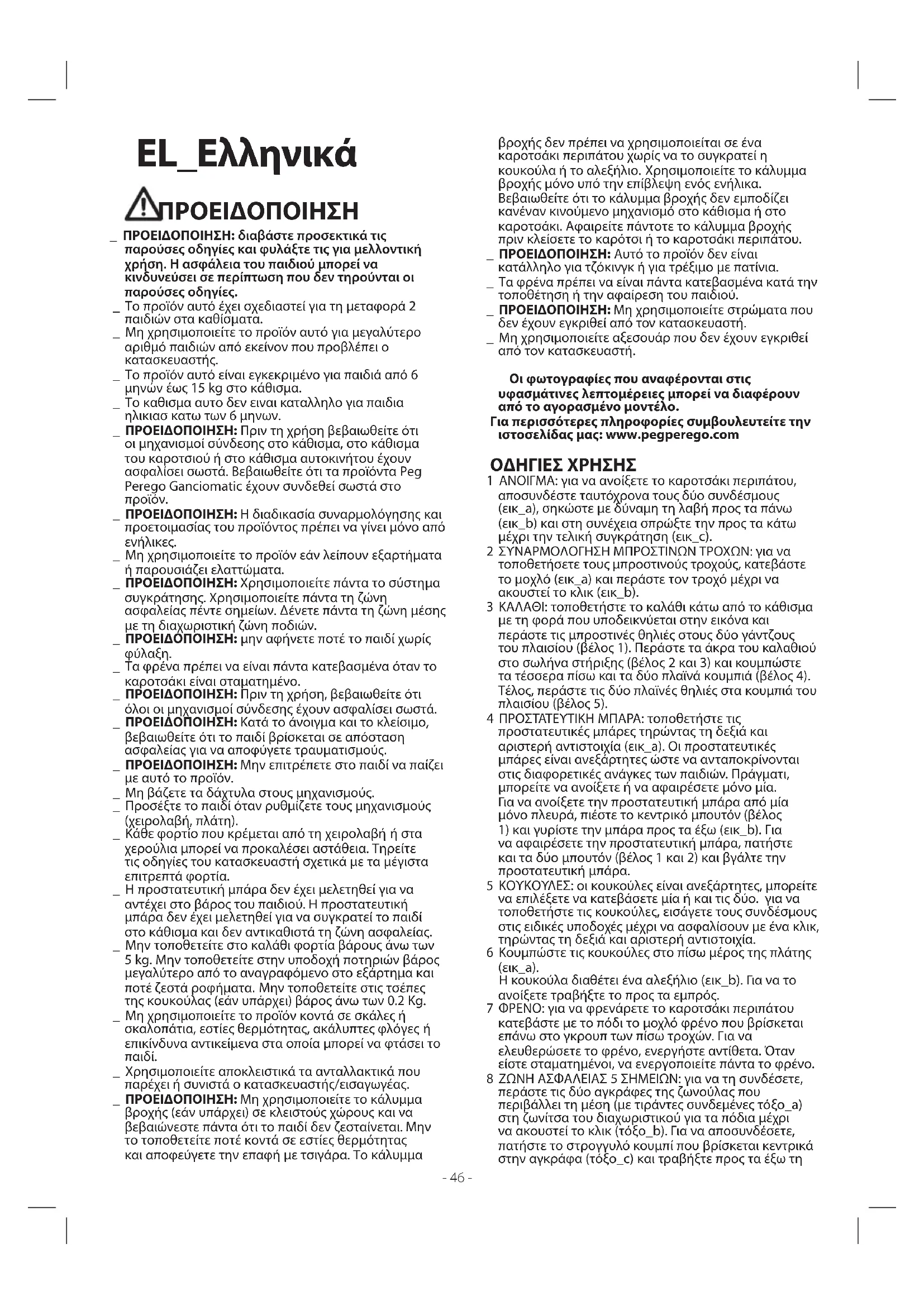 _ Χρησιμοποιείτε αποκλειστικά τα ανταλλακτικά που παρέχει ή συνιστά ο κατασκευαστής/εισαγωγέας. _ ΠΡΟΕΙΔΟΠΟΙΗΣΗ: Μη χρησιμοποιείτε το κάλυμμα βροχής (εάν υπάρχει) σε κλειστούς χώρους και να βεβαιώνεστε πάντα ότι το παιδί δεν ζεσταίνεται. Μην το τοποθετείτε ποτέ κοντά σε εστίες θερμότητας και αποφεύγετε την επαφή με τσιγάρα. Το κάλυμμα βροχής δεν πρέπει να χρησιμοποιείται σε ένα καροτσάκι περιπάτου χωρίς να το συγκρατεί η κουκούλα ή το αλεξήλιο. Χρησιμοποιείτε το κάλυμμα βροχής μόνο υπό την επίβλεψη ενός ενήλικα. Βεβαιωθείτε ότι το κάλυμμα βροχής δεν εμποδίζει κανέναν κινούμενο μηχανισμό στο κάθισμα ή στο καροτσάκι. Αφαιρείτε πάντοτε το κάλυμμα βροχής πριν κλείσετε το καρότσι ή το καροτσάκι περιπάτου. _ ΠΡΟΕΙΔΟΠΟΙΗΣΗ: Αυτό το προϊόν δεν είναι κατάλληλο για τζόκινγκ ή για τρέξιμο με πατίνια. _ Τα φρένα πρέπει να είναι πάντα κατεβασμένα κατά την τοποθέτηση ή την αφαίρεση του παιδιού. _ ΠΡΟΕΙΔΟΠΟΙΗΣΗ: Μη χρησιμοποιείτε στρώματα που δεν έχουν εγκριθεί από τον κατασκευαστή. _ Μη χρησιμοποιείτε αξεσουάρ που δεν έχουν εγκριθεί από τον κατασκευαστή. Οι φωτογραφίες που αναφέρονται στις υφασμάτινες λεπτομέρειες μπορεί να διαφέρουν από το αγορασμένο μοντέλο. Για περισσότερες πληροφορίες συμβουλευτείτε την ιστοσελίδας μας: www.pegperego.com ΟΔΗΓΙΕΣ ΧΡΗΣΗΣ 1 ΑΝΟΙΓΜΑ: για να ανοίξετε το καροτσάκι περιπάτου, αποσυνδέστε ταυτόχρονα τους δύο συνδέσμους (εικ_a), σηκώστε με δύναμη τη λαβή προς τα πάνω (εικ_b) και στη συνέχεια σπρώξτε την προς τα κάτω μέχρι την τελική συγκράτηση (εικ_c). 2 ΣΥΝΑΡΜΟΛΟΓΗΣΗ ΜΠΡΟΣΤΙΝΩΝ ΤΡΟΧΩΝ: για να τοποθετήσετε τους μπροστινούς τροχούς, κατεβάστε το μοχλό (εικ_a) και περάστε τον τροχό μέχρι να ακουστεί το κλικ (εικ_b). 3 ΚΑΛΑΘΙ: τοποθετήστε το καλάθι κάτω από το κάθισμα με τη φορά που υποδεικνύεται στην εικόνα και περάστε τις μπροστινές θηλιές στους δύο γάντζους του πλαισίου (βέλος 1). Περάστε τα άκρα του καλαθιού στο σωλήνα στήριξης (βέλος 2 και 3) και κουμπώστε τα τέσσερα πίσω και τα δύο πλαϊνά κουμπιά (βέλος 4). Τέλος, περάστε τις δύο πλαϊνές θηλιές στα κουμπιά του πλαισίου (βέλος 5). 4 ΠΡΟΣΤΑΤΕΥΤΙΚΗ ΜΠΑΡΑ: τοποθετήστε τις προστατευτικές μπάρες τηρώντας τη δεξιά και αριστερή αντιστοιχία (εικ_a). Οι προστατευτικές μπάρες είναι ανεξάρτητες ώστε να ανταποκρίνονται στις διαφορετικές ανάγκες των παιδιών. Πράγματι, μπορείτε να ανοίξετε ή να αφαιρέσετε μόνο μία. Για να ανοίξετε την προστατευτική μπάρα από μία μόνο πλευρά, πιέστε το κεντρικό μπουτόν (βέλος