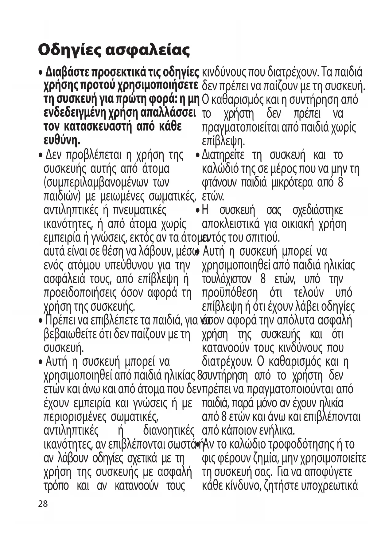 - Αυτή η συσκευή μπορεί να χρησιμοποιηθεί από παιδιά ηλικίας 8 ετών και άνω και από άτομα που δεν έχουν εμπειρία και γνώσεις ή με περιορισμένες σωματικές, αντιληπτικές ή διανοητικές ικανότητες, αν επιβλέπονται σωστά ή αν λάβουν οδηγίες σχετικά με τη χρήση της συσκευής με ασφαλή τρόπο και αν κατανοούν τους κινδύνους που διατρέχουν. Τα παιδιά δεν πρέπει να παίζουν με τη συσκευή. Ο καθαρισμός και η συντήρηση από το χρήστη δεν πρέπει να πραγματοποιείται από παιδιά χωρίς