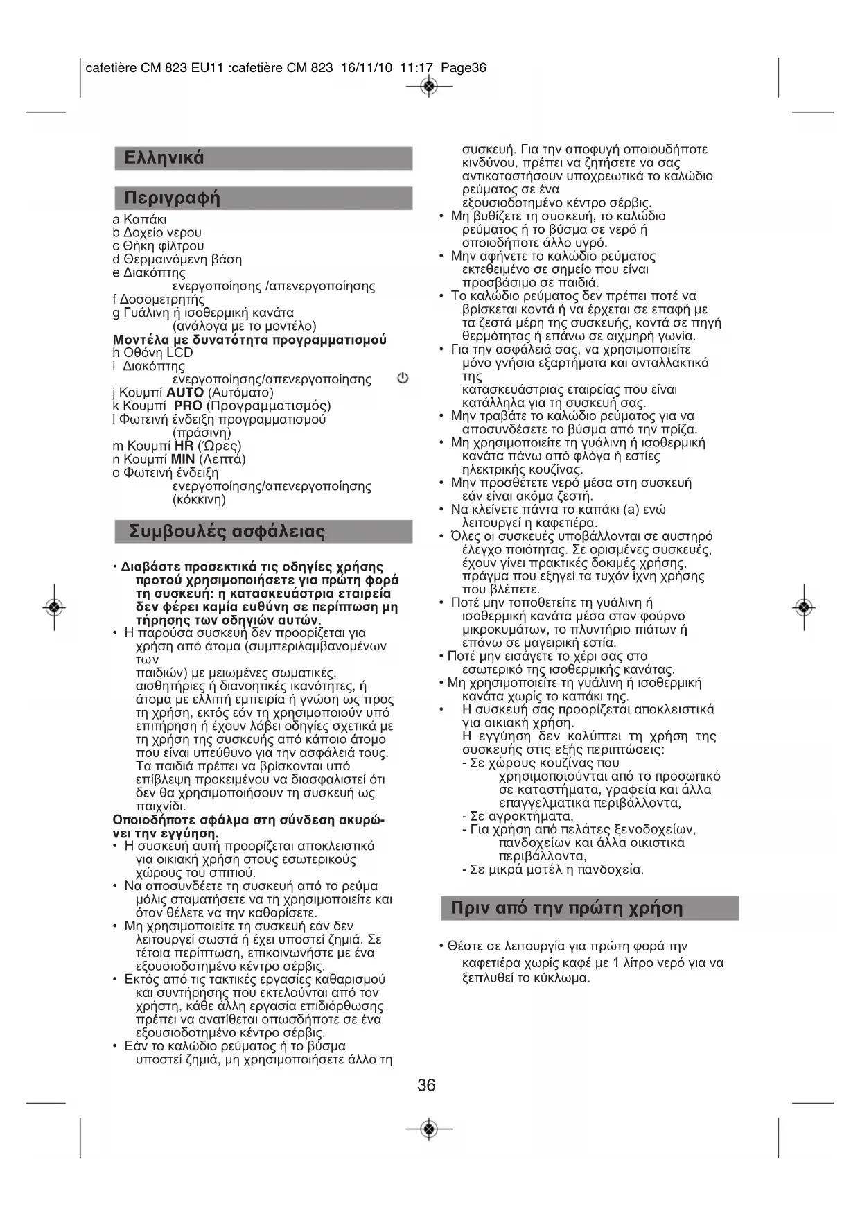 ﻩﺎـﮕﺘﺳﺩ ﺡﺮـﺷ ﯽﻨﻤﯾﺍ یﺎﻬﻠﻤﻌﻟﺍﺭﻮﺘﺳﺩ ﺭﺎﺑ ﻦﯿﻟﻭﺍ یﺍﺮﺑ ﻩﺩﺎﻔﺘﺳﺍ ﺯﺍ ﻞﺒﻗ ﻩﻮـﻬﻗ ﻥﺩﺮﻛ ﺖﺳﺭﺩ cafetière CM 823 EU11 :cafetière CM 823 16/11/10 11:17 Page3536 a Καπάκι b Δοχείο νερου c Θήκη φίλτρου d Θερμαινόμενη βάση e Διακόπτης ενεργοποίησης /απενεργοποίησης f Δοσομετρητής g Γυάλινη ή ισοθερμική κανάτα (ανάλογα με το μοντέλο) Μοντέλα με δυνατότητα προγραμματισμού h Οθόνη LCD i Διακόπτης ενεργοποίησης/απενεργοποίησης j Κουμπί AUTO (Αυτόματο) k Κουμπί PRO (Προγραμματισμός) l Φωτεινή ένδειξη προγραμματισμού