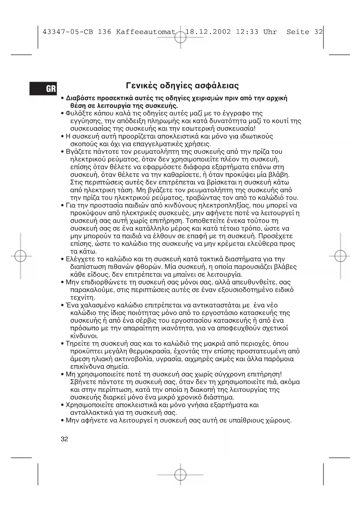 - Μην αφήνετε να λειτουργεί η συσκευή σας αυτή σε υπαίθριους χώρους. 43347-05-CB 136 Kaffeeautomat 18.12.2002 12:33 Uhr Seite 3233