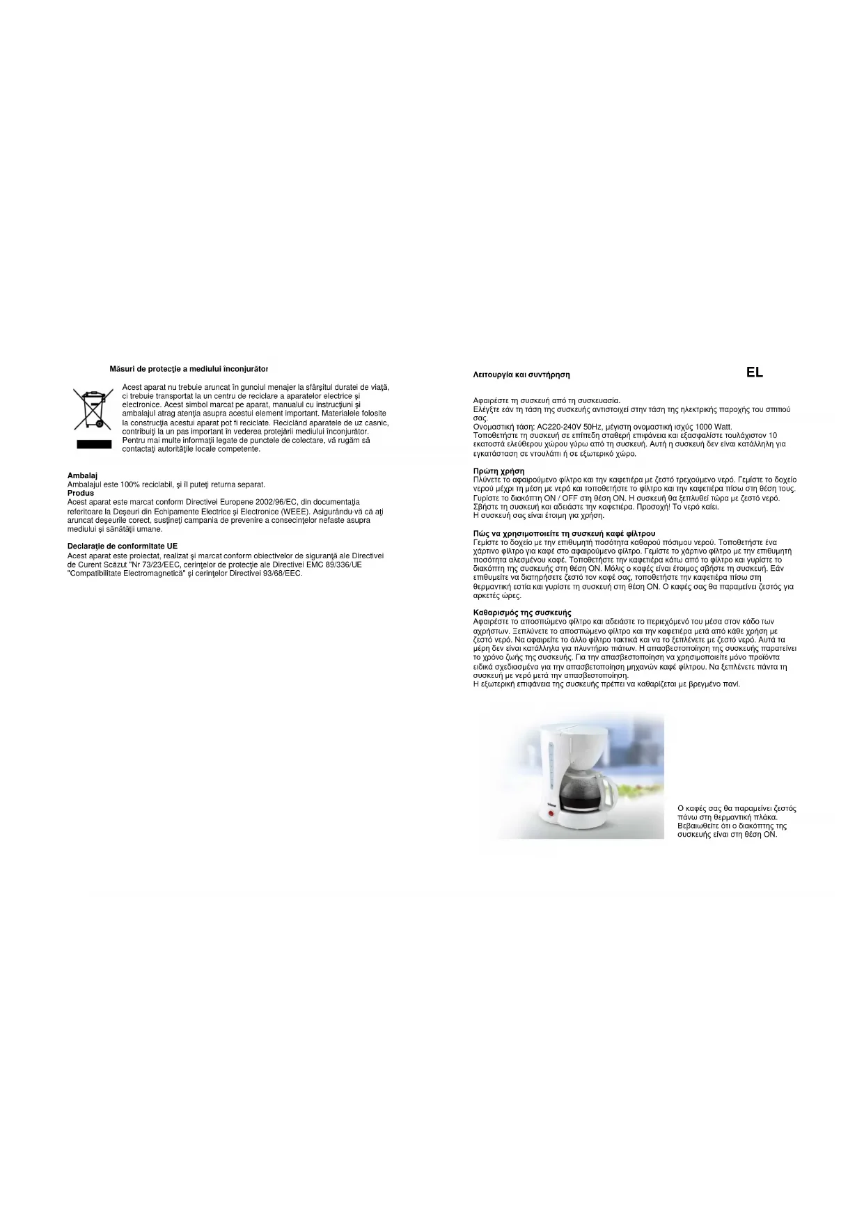 Ονοµαστική τάση: AC220-240V 50Hz, µέγιστη ονοµαστική ισχύς 1000 Watt. Τοποθετήστε τη συσκευή σε επίπεδη σταθερή επιφάνεια και εξασφαλίστε τουλάχιστον 10 εκατοστά ελεύθερου χώρου γύρω από τη συσκευή. Αυτή η συσκευή δεν είναι κατάλληλη για εγκατάσταση σε ντουλάπι ή σε εξωτερικό χώρο. Πρώτη χρήση Πλύνετε το αφαιρούµενο φίλτρο και την καφετιέρα µε ζεστό τρεχούµενο νερό. Γεµίστε το δοχείο νερού µέχρι τη µέση µε νερό και τοποθετήστε το φίλτρο και την καφετιέρα πίσω στη θέση τους. Γυρίστε το διακόπτη ON / OFF στη θέση ON. Η συσκευή θα ξεπλυθεί τώρα µε ζεστό νερό. Σβήστε τη συσκευή και αδειάστε την καφετιέρα. Προσοχή! Το νερό καίει. Η συσκευή σας είναι έτοιµη για χρήση. Πώς να χρησιµοποιείτε τη συσκευή καφέ φίλτρου Γεµίστε το δοχείο µε την επιθυµητή ποσότητα καθαρού πόσιµου νερού. Τοποθετήστε ένα χάρτινο φίλτρο για καφέ στο αφαιρούµενο φίλτρο. Γεµίστε το χάρτινο φίλτρο µε την επιθυµητή ποσότητα αλεσµένου καφέ. Τοποθετήστε την καφετιέρα κάτω από το φίλτρο και γυρίστε το διακόπτη της συσκευής στη θέση ON. Μόλις ο καφές είναι έτοιµος σβήστε τη συσκευή. Εάν επιθυµείτε να διατηρήσετε ζεστό τον καφέ σας, τοποθετήστε την καφετιέρα πίσω στη θερµαντική εστία και γυρίστε τη συσκευή στη θέση ON. Ο καφές σας θα παραµείνει ζεστός για αρκετές ώρες. Καθαρισµός της συσκευής Αφαιρέστε το αποσπώµενο φίλτρο και αδειάστε το περιεχόµενό του µέσα στον κάδο των αχρήστων. Ξεπλύνετε το αποσπώµενο φίλτρο και την καφετιέρα µετά από κάθε χρήση µε ζεστό νερό. Να αφαιρείτε το άλλο φίλτρο τακτικά και να το ξεπλένετε µε ζεστό νερό. Αυτά τα µέρη δεν είναι κατάλληλα για πλυντήριο πιάτων. Η απασβεστοποίηση της συσκευής παρατείνει το χρόνο ζωής της συσκευής. Για την απασβεστοποίηση να χρησιµοποιείτε µόνο προϊόντα ειδικά σχεδιασµένα για την απασβετοποίηση µηχανών καφέ φίλτρου. Να ξεπλένετε πάντα τη συσκευή µε νερό µετά την απασβεστοποίηση. Η εξωτερική επιφάνεια της συσκευής πρέπει να καθαρίζεται µε βρεγµένο πανί.
