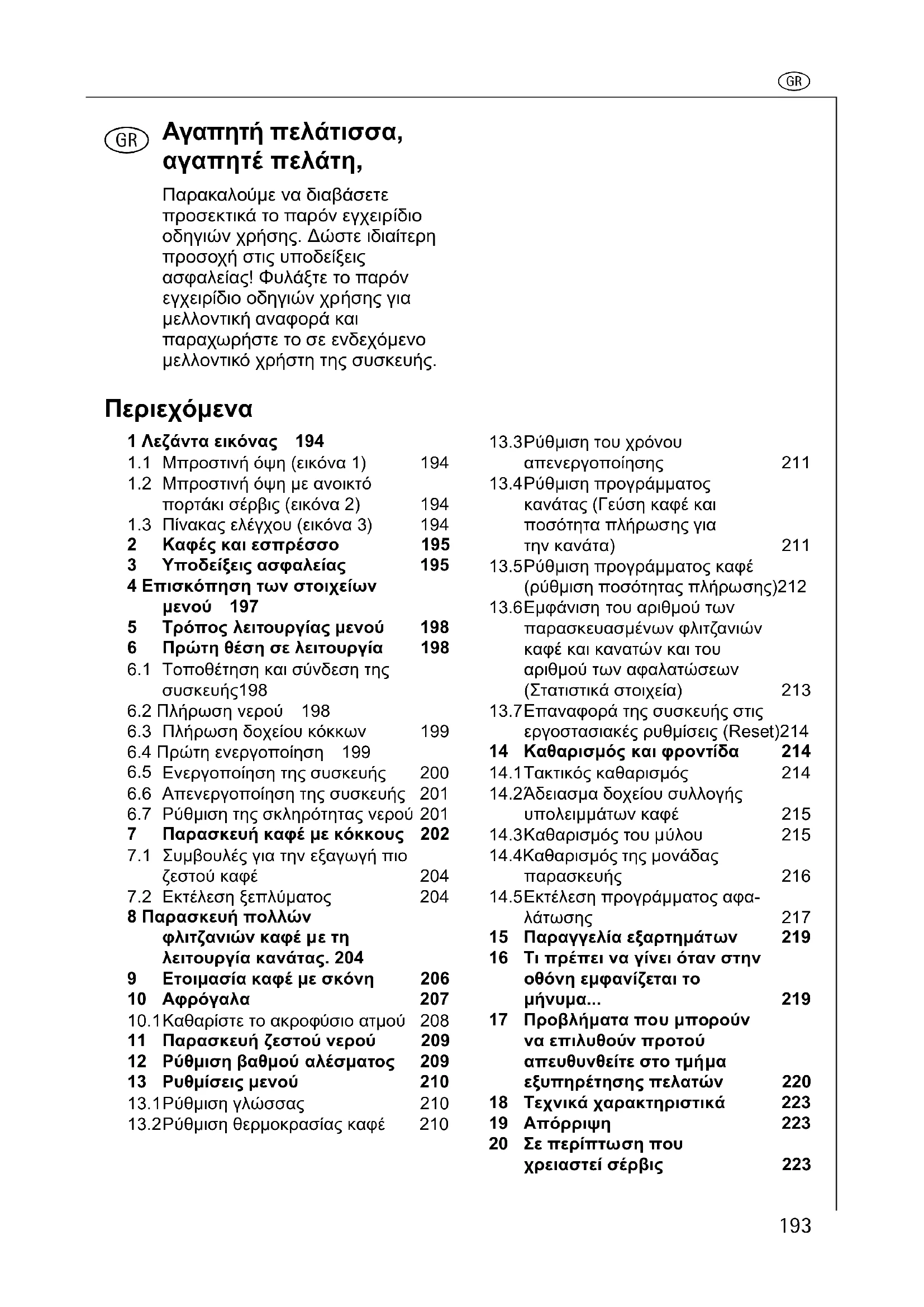 8 Παρασκευή πολλών φλιτζανιών καφέ µε τη λειτουργία κανάτας. 204 9 Ετοιµασία καφέ µε σκόνη 206 10 Αφρόγαλα 207 10.1Καθαρίστε το ακροφύσιο ατµού 208 11 Παρασκευή ζεστού νερού 209 12 Ρύθµιση βαθµού αλέσµατος 209 13 Ρυθµίσεις µενού 210 13.1Ρύθµιση γλώσσας 210 13.2Ρύθµιση θερµοκρασίας καφέ 210 13.3Ρύθµιση του χρόνου απενεργοποίησης 211 13.4Ρύθµιση προγράµµατος κανάτας (Γεύση καφέ και ποσότητα πλήρωσης για την κανάτα)211 13.5Ρύθµιση προγράµµατος καφέ (ρύθµιση ποσότητας πλήρωσης)212 13.6Εµφάνιση του αριθµού των παρασκευασµένων φλιτζανιών καφέ και κανατών και του αριθµού των αφαλατώσεων (Στατιστικά στοιχεία)213 13.7Επαναφορά της συσκευής στις εργοστασιακές ρυθµίσεις (Reset)214 14 Καθαρισµός και φροντίδα 214 14.1Τακτικός καθαρισµός 214 14.2Άδειασµα δοχείου συλλογής υπολειµµάτων καφέ 215 14.3Καθαρισµός του µύλου 215 14.4Καθαρισµός της µονάδας παρασκευής 216 14.5Εκτέλεση προγράµµατος αφα- λάτωσης 217 15 Παραγγελία εξαρτηµάτων 219 16 Τι πρέπει να γίνει όταν στην οθόνη εµφανίζεται το µήνυµα... 219 17 Προβλήµατα που µπορούν να επιλυθούν προτού απευθυνθείτε στο τµήµα εξυπηρέτησης πελατών 220 18 Τεχνικά χαρακτηριστικά 223 19 Απόρριψη 223 20 Σε περίπτωση που χρειαστεί σέρβις 223r