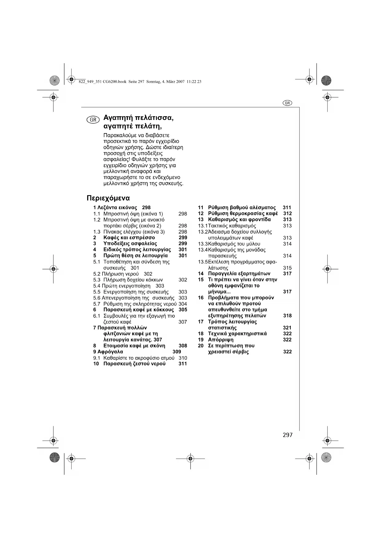 12 Ρύθµιση θερµοκρασίας καφέ 312 13 Καθαρισµός και φροντίδα 313 13.1Τακτικός καθαρισµός 313 13.2Άδειασµα δοχείου συλλογής υπολειµµάτων καφέ 313 13.3Καθαρισµός του µύλου 314 13.4Καθαρισµός της µονάδας παρασκευής 314 13.5Εκτέλεση προγράµµατος αφα- λάτωσης 315 14 Παραγγελία εξαρτηµάτων 317 15 Τι πρέπει να γίνει όταν στην οθόνη εµφανίζεται το µήνυµα... 317 16 Προβλήµατα που µπορούν να επιλυθούν προτού απευθυνθείτε στο τµήµα εξυπηρέτησης πελατών 318 17 Τρόπος λειτουργίας στατιστικής 321 18 Τεχνικά χαρακτηριστικά 322 19 Απόρριψη 322 20 Σε περίπτωση που χρειαστεί σέρβις 322 822_949_351 CG6200.book Seite 297 Sonntag, 4. März 2007 11:22 23r