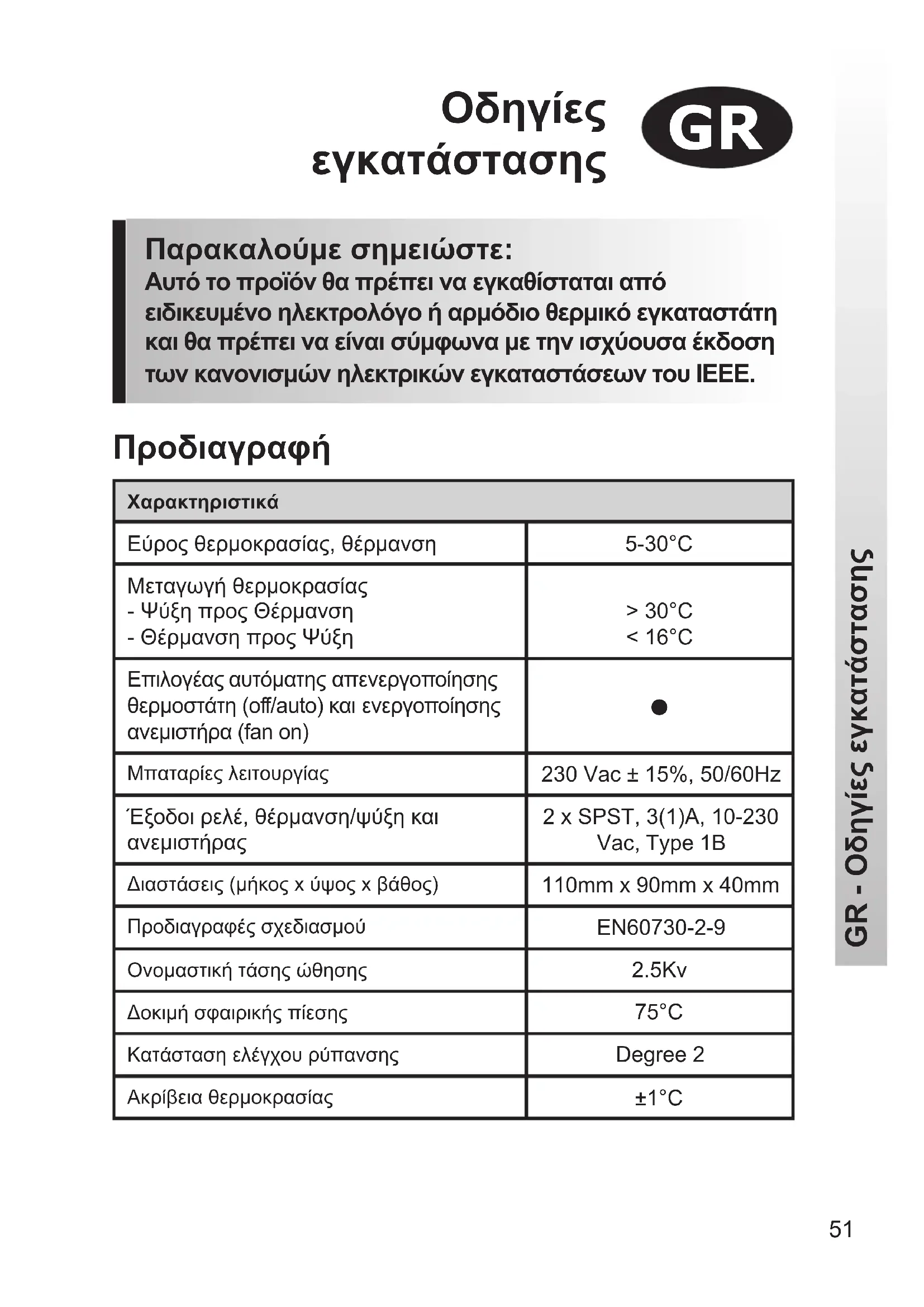 GR - Ïäçãßåò åãêáôÜóôáóçò ΧαρακτηριστικάΕύρος θερμοκρασίας, θέρμανση 5-30°CΜεταγωγή θερμοκρασίας - Ψύξη προς Θέρμανση- Θέρμανση προς Ψύξη> 30°C< 16°C Επιλογέας αυτόματης απενεργοποίησης θερμοστάτη (off/auto) και ενεργοποίησης ανεμιστήρα (fan on) Mπαταρίες λειτουργίας230 Vac ± 15%, 50/60Hz Έξοδοι ρελέ, θέρμανση/ψύξη και ανεμιστήρας2 x SPST, 3(1)A, 10-230 Vac, Type 1B Διαστάσεις (μήκος x ύψος x βάθος) 110mm x 90mm x 40mmΠροδιαγραφές σχεδιασμούEN60730-2-9Ονομαστική τάσης ώθησης2.5KvΔοκιμή σφαιρικής πίεσης 75°C Κατάσταση ελέγχου ρύπανσηςDegree 2Ακρίβεια θερμοκρασίας ±1°C ÐñïäéáãñáöÞ52 GR - Ïäçãßåò åãêáôÜóôáóçò Γενική εικόνα του προϊόντος Ο θερμοστάτης είναι σχεδιασμένος για χρήση σε συστήματα εφοδιασμένα με fan coils που εξυπηρετούνται από κεντρικό σύστημα μεταγωγής 2 σωλήνων. Ο θερμοστάτης ελέγχει τη λειτουργία μηχανοκίνητης βαλβίδας, η οποία κατά τις περιόδους θέρμανσης ανοίγει όταν απαιτείται θερμότητα και κατά τις περιόδους ψύξης ανοίγει όταν απαιτείται ψύξη. Η μεταγωγή από θέρμανση σε ψύξη επιτυγχάνεται αυτομάτως