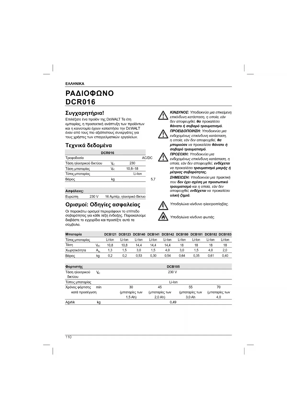 Συγχαρητήρια! Επιλέξατε ένα προϊόν της DEWALT Τα έτη εμπειρίας, η προσεκτική ανάπτυξη των προϊόντων και η καινοτομία έχουν καταστήσει την DEWALT έναν από τους πιο αξιόπιστους συνεργάτες για τους χρήστες των επαγγελματικών εργαλείων. Τεχνικά δεδομένα DCR016 Τροφοδοσία AC/DC Τάση ηλεκτρικού δικτύου V