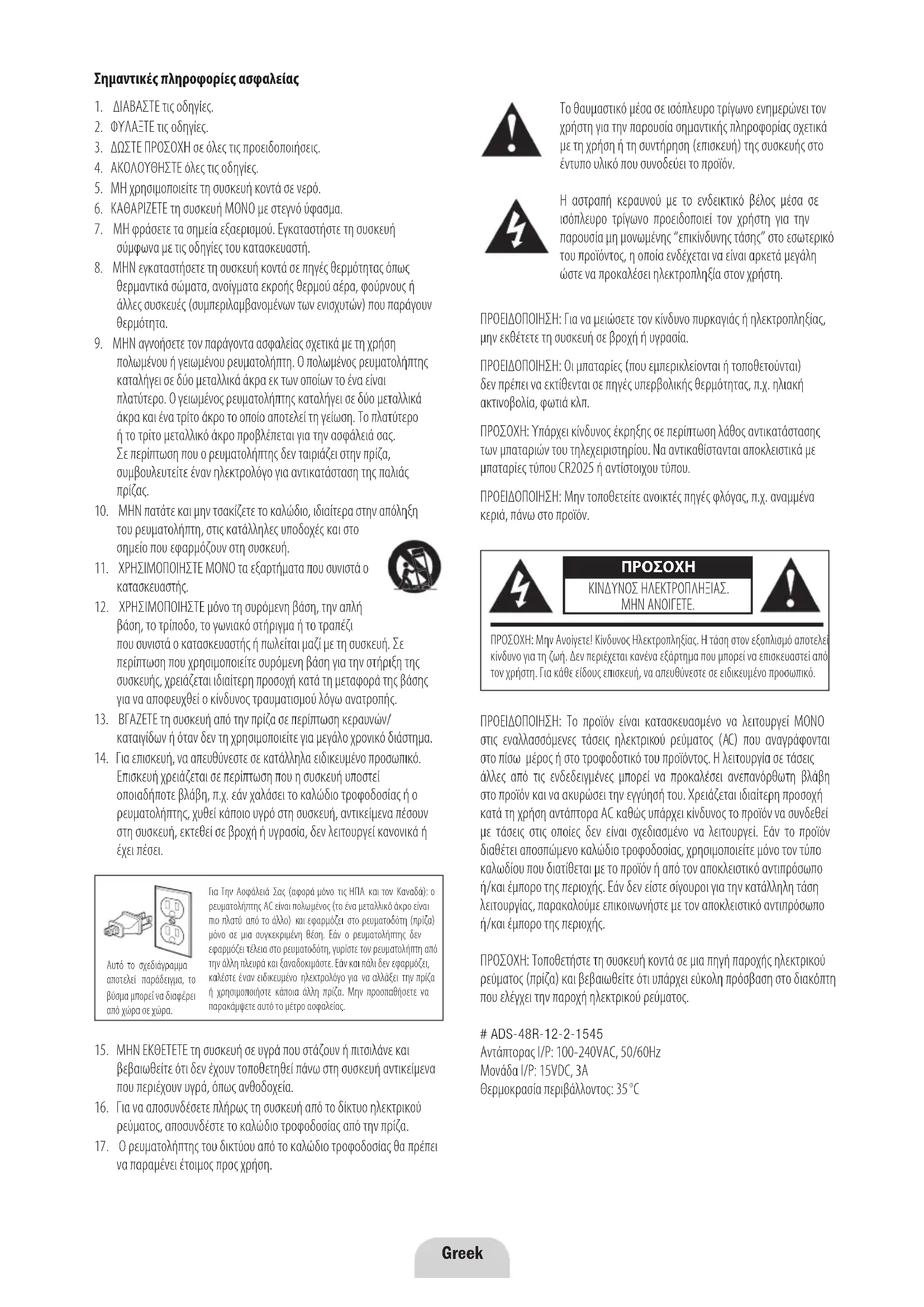πολωμένου ή γειωμένου ρευματολήπτη. Ο πολωμένος ρευματολήπτης καταλήγει σε δύο μεταλλικά άκρα εκ των οποίων το ένα είναι πλατύτερο. Ο γειωμένος ρευματολήπτης καταλήγει σε δύο μεταλλικά άκρα και ένα τρίτο άκρο το οποίο αποτελεί τη γείωση. Το πλατύτερο ή το τρίτο μεταλλικό άκρο προβλέπεται για την ασφάλειά σας. Σε περίπτωση που ο ρευματολήπτης δεν ταιριάζει στην πρίζα, συμβουλευτείτε έναν ηλεκτρολόγο για αντικατάσταση της παλιάς